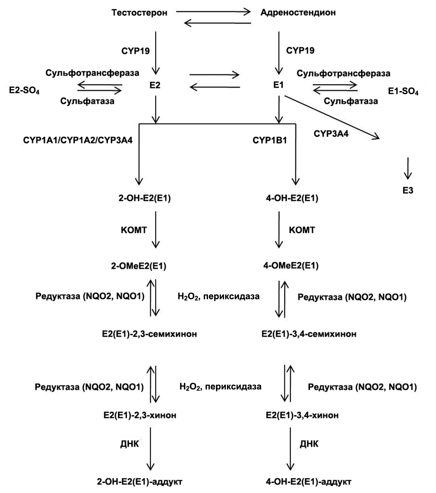 Элиминация эстроген-3,4-хинонов возможна путем конъюгации с глутатионом или путем восстановления катехолэстрогенов с помощью хинонредуктазы (NQO1 и NQO2). Чрезмерное образование депуринирующих аддуктов является результатом грубого нарушения баланса между активирующим и дезактивирующим путями метаболизма эстрогена. Гиперактивация фермента ароматазы (CYP19), приводящая к синтезу эстрогенов in situ, сверхэкспрессия сульфатазы, переводящей неактивные сульфатные формы эстрогенов в Е2 и Е1, нерегулируемая активность CYP1B1 и синтез, прежде всего, 4-OH-производных, низкие концентрации глутатиона при дефиците хинонредуктаз – все это элементы сценария упорного производства хинонов.