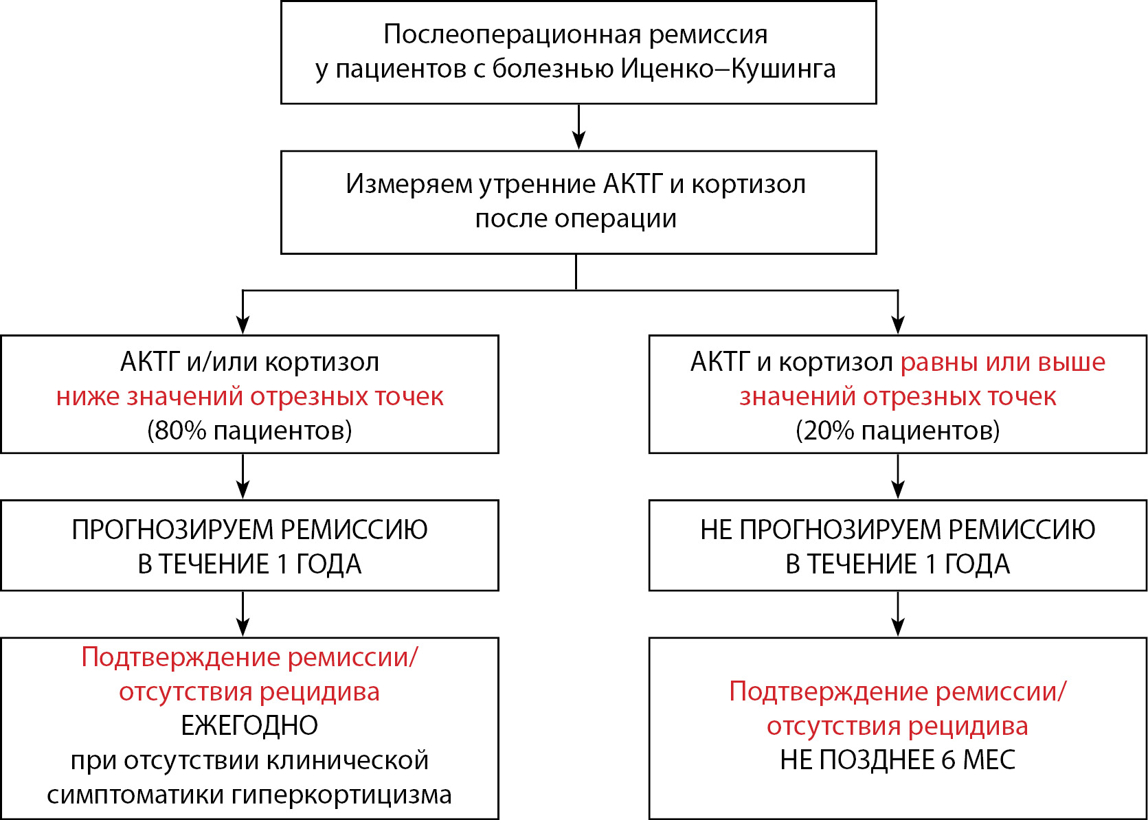 4. Fig. 4. Algorithm for personalized management of patients with Itsenko-Cushing's disease after primary transnasal adenomectomy, depending on the prognosis of relapse or remission of the disease.