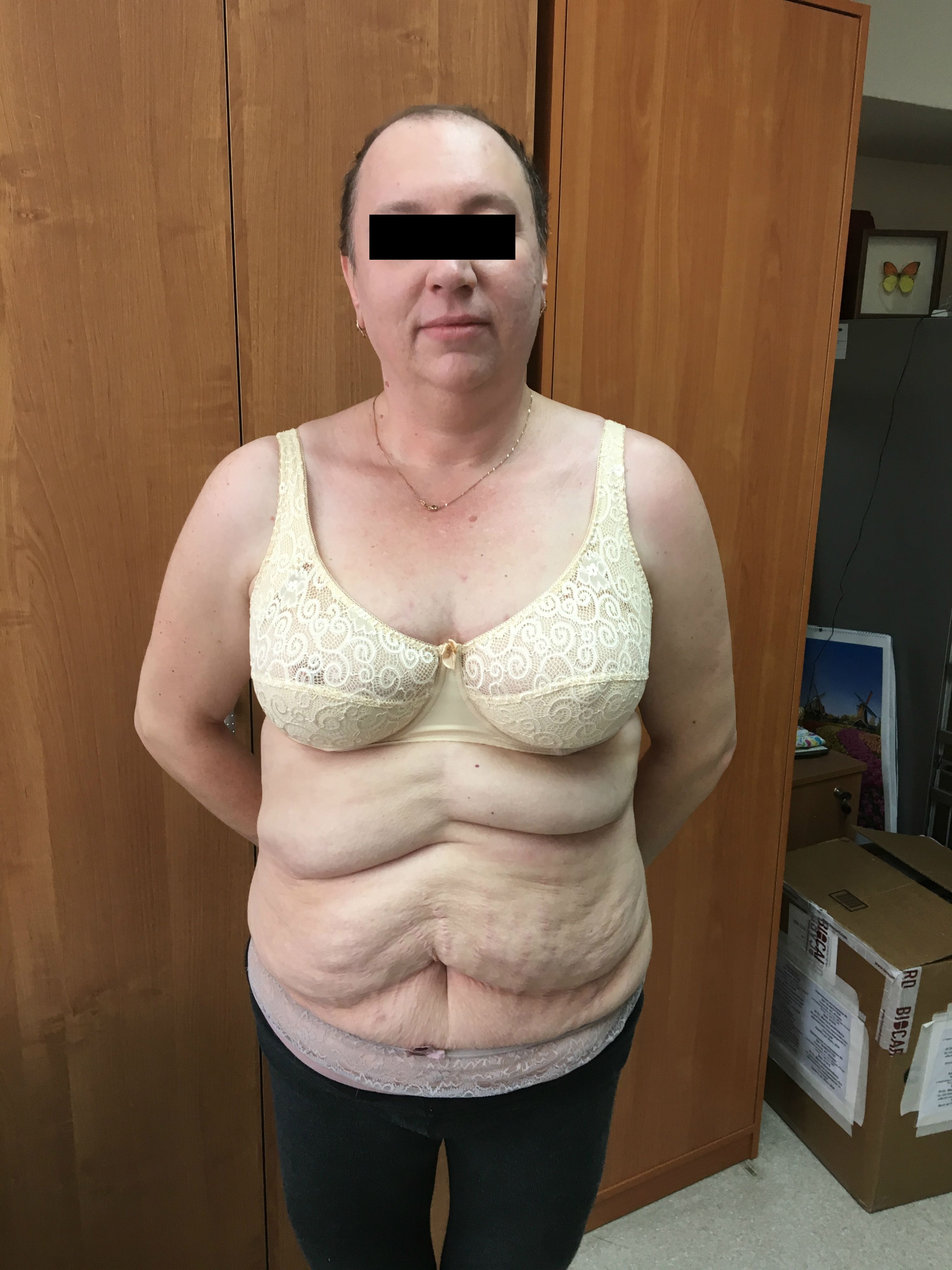 Рис. 2. Внешний вид пациентки Ш. до операции – гиперемия и угревая сыпь на спине, выпадение волос на голове, чрезмерное развитие подкожно-жировой клетчатки на животе.