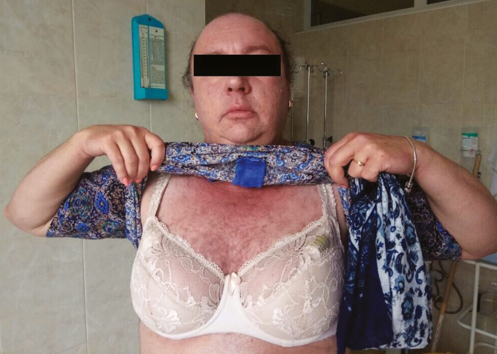 8. PICTURE 7. The appearance of the patient Sh. 2 years after surgery, the absence of acne, body hair on the chest, abdomen | |