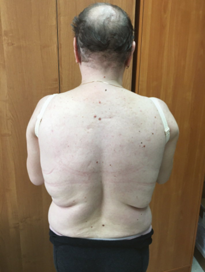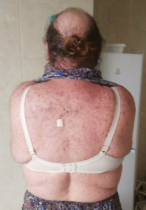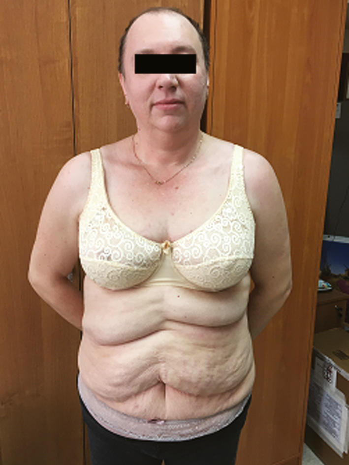 2. Fig. 2. Appearance of patient Sh. Before surgery - hyperemia and acne on the back, hair loss on the head, excessive development of subcutaneous fat on the abdomen. | |