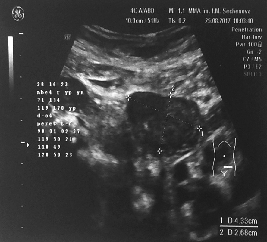 3. Fig. 3. Ultrasound of the pelvic organs. The increase in size and structural changes in the left ovary (43 × 27 × 42 mm). Enlarged uterus (61 × 52 × 75 mm), uterine fibroids of different sizes. | |