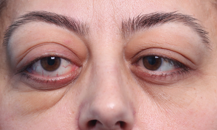Через 6 мес после начала ухудшения отметила появление выраженного экзофтальма, болей в проекции правой орбиты, слезотечения, отеков век. Концентрация тиреоидных гормонов была в пределах нормы (ТТГ 1,22 мМЕ/л, свободного Т4 12,5 пмоль/л), содержание антител к рецептору ТТГ составляла 0,3 МЕ/л. Отмечались небольшое превышение содержания антител к ТПО до 22,7 МЕ/м (при норме до 5,6 МЕ/м), увеличение объема ЩЖ до 21 см3, умеренное снижение эхогенности с множественными мелкими гипоэхогенными зонами, неизмененная васкуляризация. При объективном исследовании обращали на себя внимание отек век, более выраженный справа, расширение эписклеральных сосудов, двусторонний экзофтальм, более выраженный справа (правый глаз (OD) 26 мм, левый глаз (OS) 22 мм), затруднение репозиции глазных яблок, вторичное косоглазие слева, нечеткость границ зрительного нерва при офтальмоскопии (рис. 1). Проведена МСКТ орбит: КТ-картина выраженного экзофтальма, утолщения глазодвигательных мышц (наружной и нижней прямых), значительное увеличение слезных желез (справа 30,0×15,8 мм, слева 25,0×11,5 мм, при норме: длина 5,4–12,9×2,7–6,5 мм), структура однородная, плотность снижена: справа 52 НU, слева 52 НU, признаки апикального сгущения справа (рис. 2).