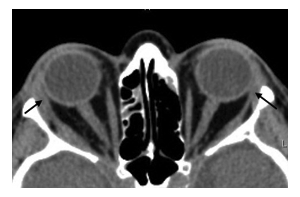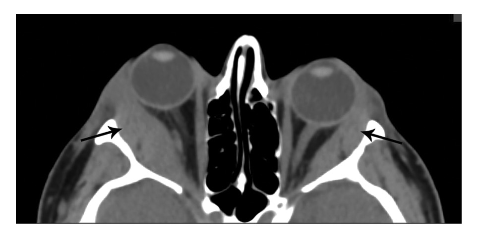 Рис. 2. МСКТ орбит (аксиальная проекция) до лечения. Выраженное утолщение наружной прямой мышцы, увеличение слезных желез (стрелки).