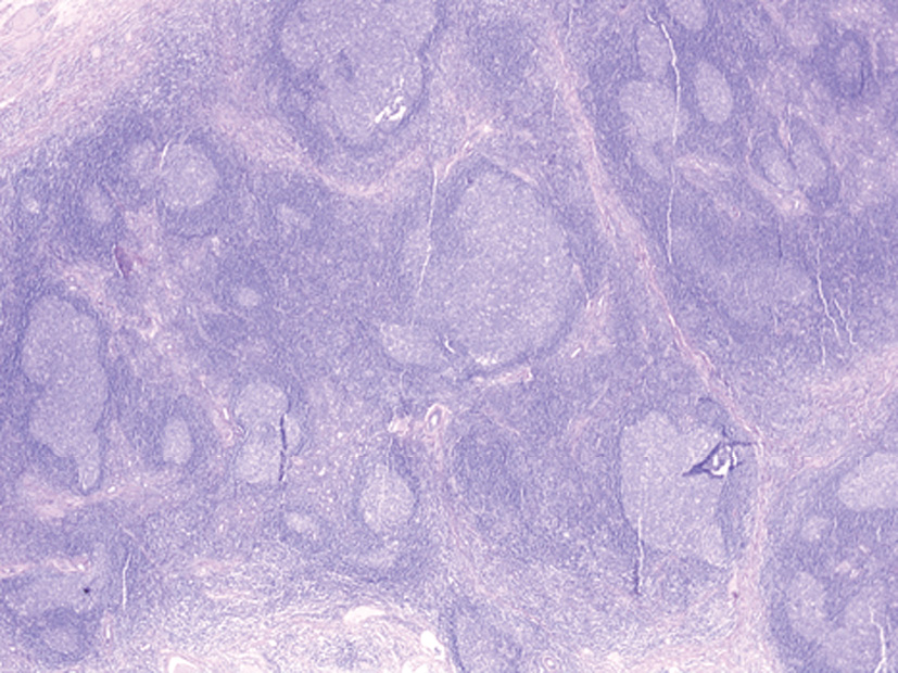 Рис. 3. Лимфоидная инфильтрация ткани слезной железы представлена многочисленными вторичными фолликулами. Окраска гематоксилином и эозином (ув. ×25). Доступен на цветной вклейке и в сети Интернет: https://doi.org/10.14341/probl10223-4022 |