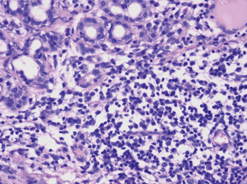 При гистологическом исследовании выявлены фрагменты фиброзной ткани со структурами слезной железы, многочисленными лимфоидными фолликулами с широкими центрами размножения; присутствовали пласты зрелых плазматических клеток, расположенных парафолликулярно, перидуктально, часть из них – интрафолликулярно, с примесью эозинофильных гранулоцитов (рис. 3, 4).