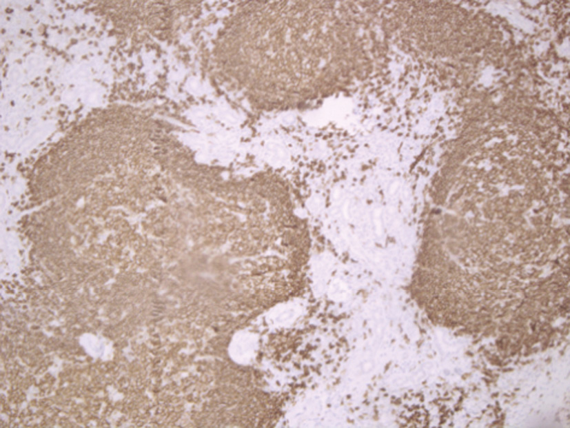 Рис. 5. Лимфоидные фолликулы представлены четко очерченными В-клеточными структурами. Реакция с антителами к CD20.