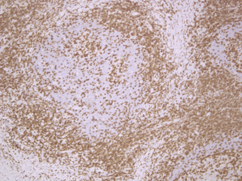 Рис. 6. Интерфолликулярно преобладают Т-клетки. Реакция с антителами к CD3. Иммуноферментный метод (ув. ×100). Доступен на цветной вклейке и в сети Интернет: https://doi.org/10.14341/probl10223-4025 |