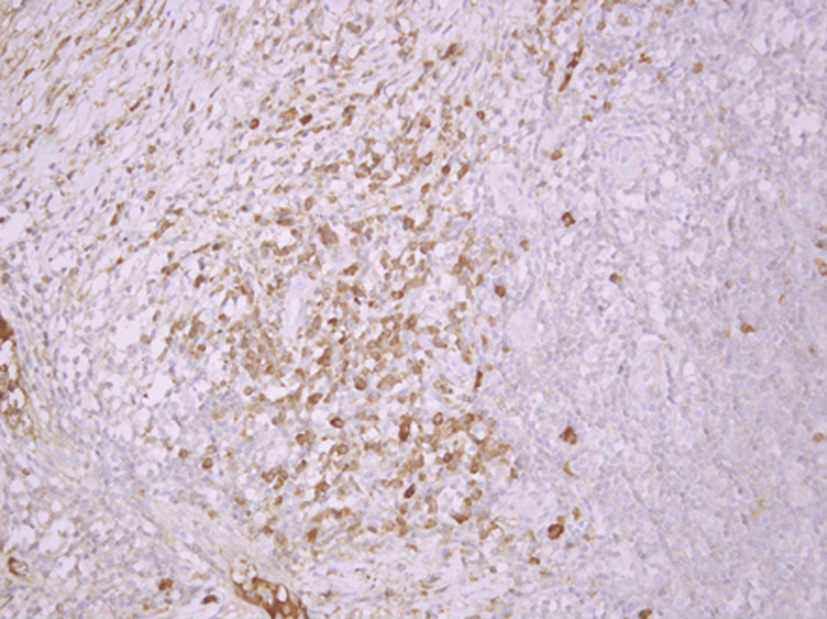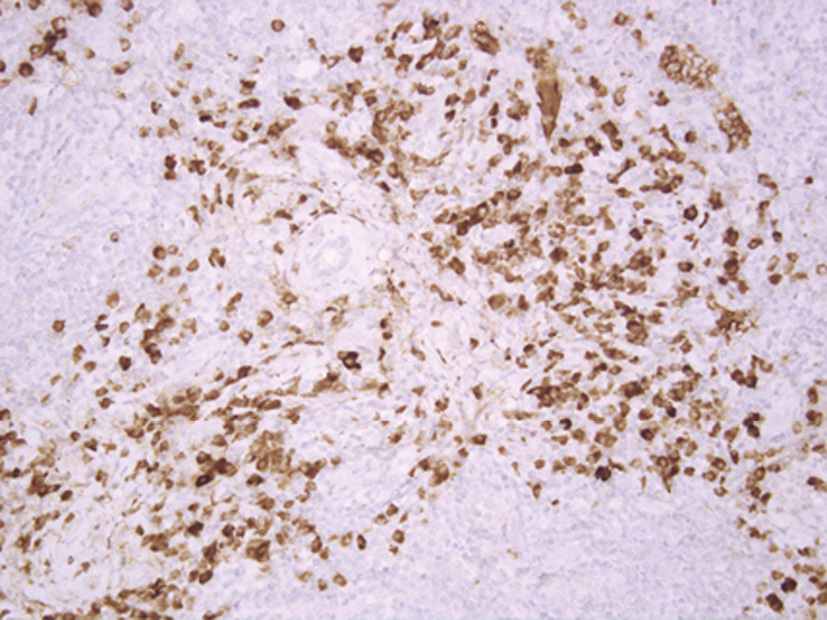 Рис. 8. Пласты зрелых плазматических клеток экспрессируют IgG4 (IgG/IgG4>40%).