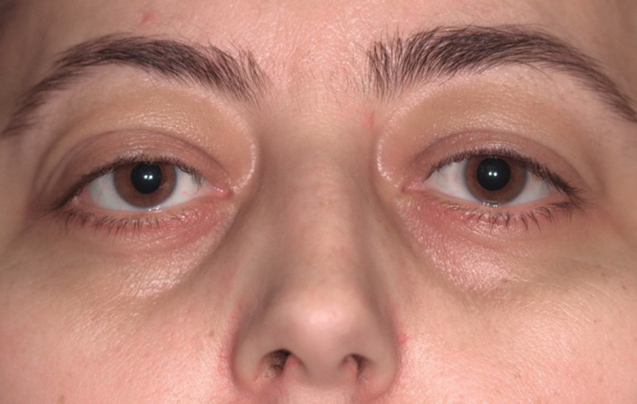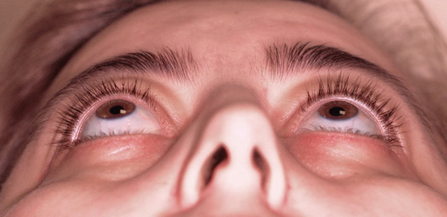 Глаза расположены правильно: а – вид анфас, ортотропия, справа сохранялся минимальный птоз верхнего века; б – вид с запрокинутой головой, экзофтальм отсутствует.