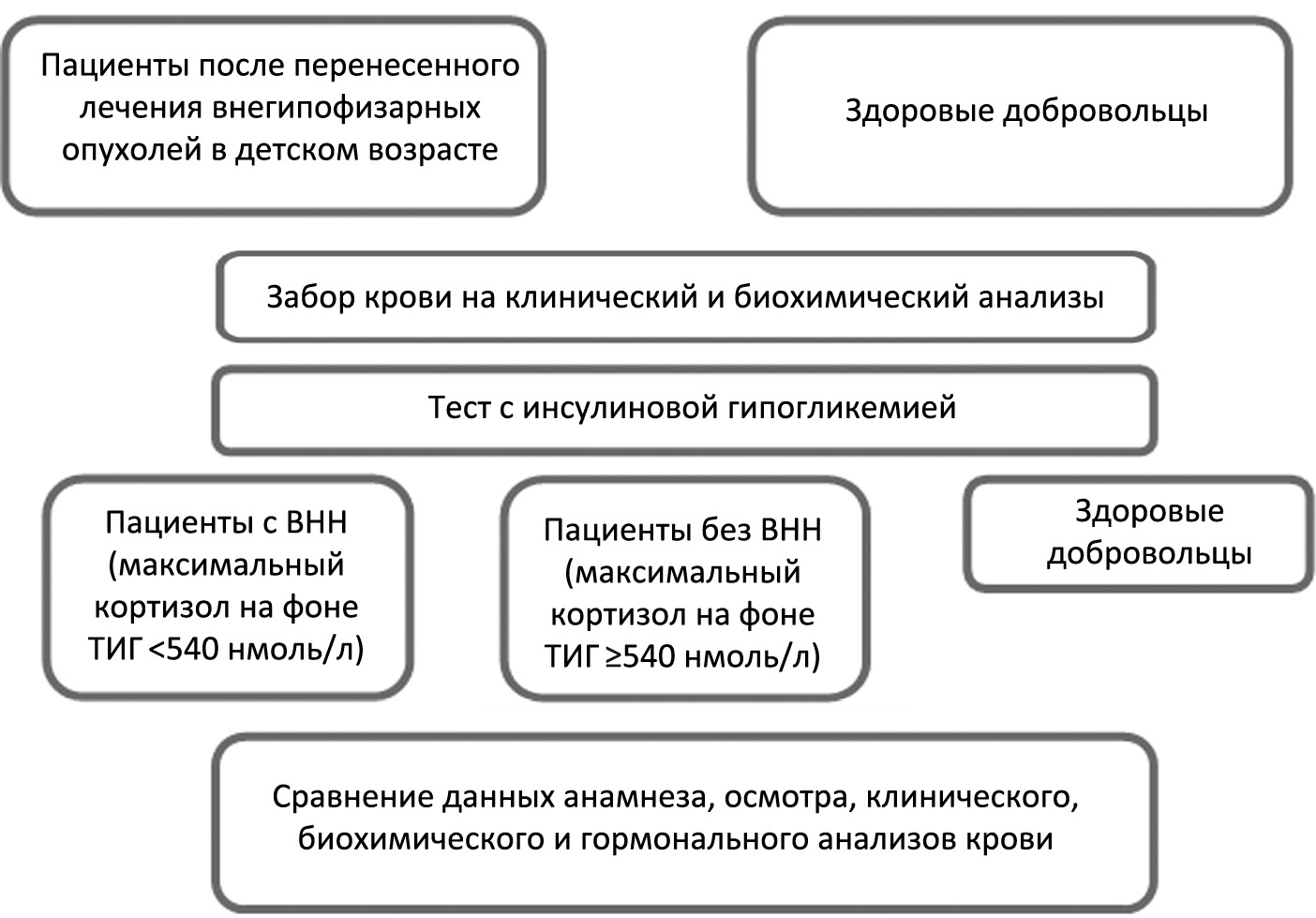 В исследование включались пациенты, находящиеся на динамическом наблюдении у врачей-онкологов в федеральных клинических центрах (ФГБУ «РНЦРР», ФГАУ «НМИЦ нейрохирургии им. Н.Н. Бурденко», ФГБУ «НМИЦ ДГОИ им. Дмитрия Рогачева»), направленные или вызванные активно на консультацию к эндокринологу в Первый МГМУ им. И.М. Сеченова. Обследование пациентов проводилось в условиях стационара на базе кафедры и клиники эндокринологии Университетской клинической больницы №2 ФГАОУ ВО «Первый МГМУ им. И.М. Сеченова».