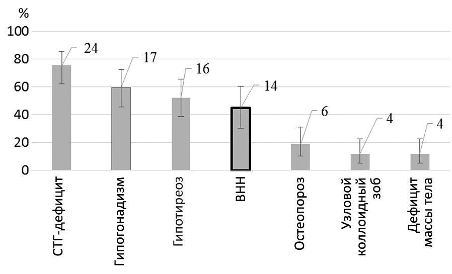 Рис. 2. Структура и распространенность отдаленных эндокринных последствий после перенесенного комплексного лечения внегипофизарных опухолей.