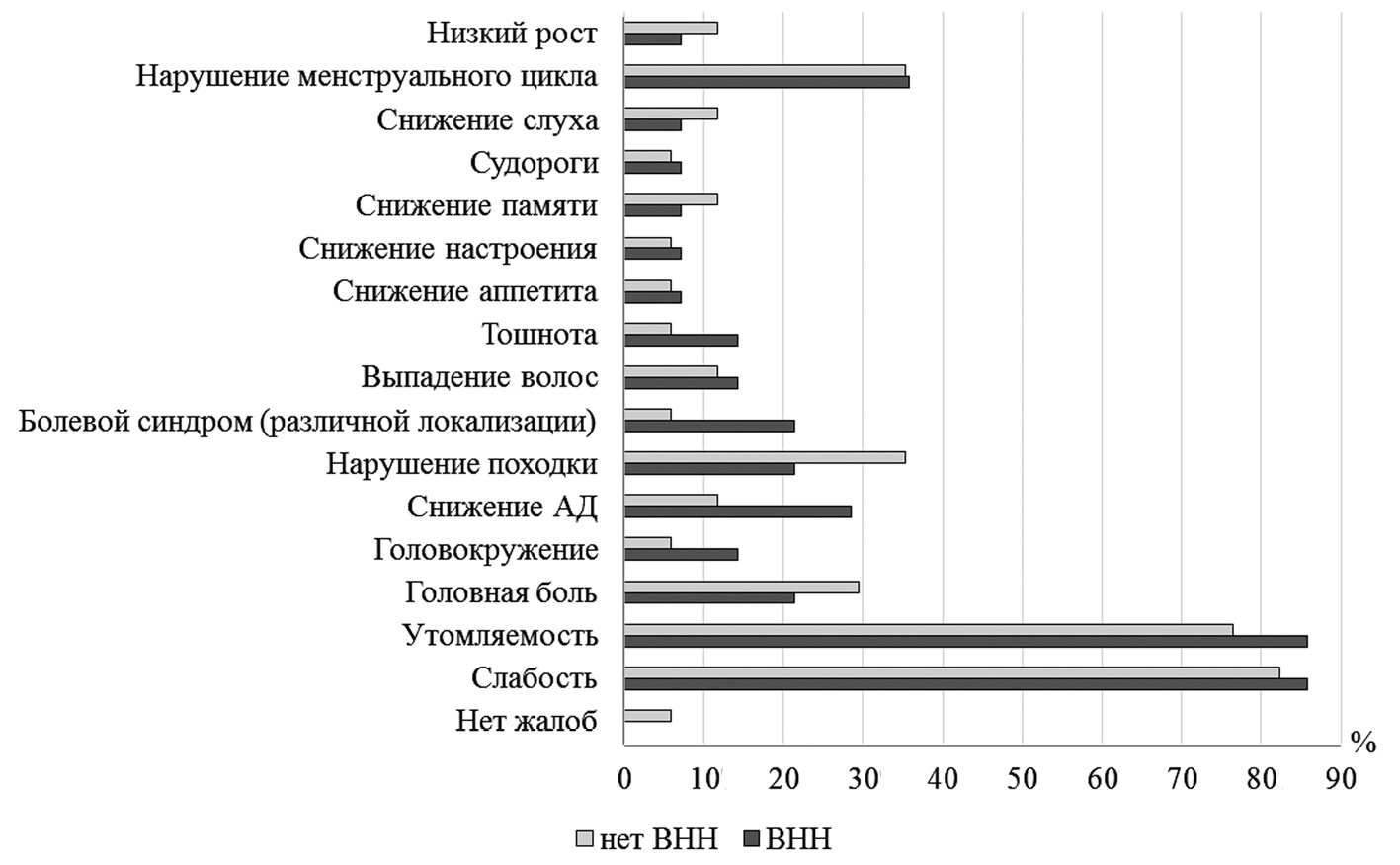 Жалобы. Пациенты с и без ВНН не различались по характеру предъявляемых жалоб (р от 0,138 до 1,0) (рис. 4). Ведущими жалобами были слабость, утомляемость, а женщины часто отмечали нарушение менструального цикла. Добровольцы из группы контроля жалоб не предъявляли.