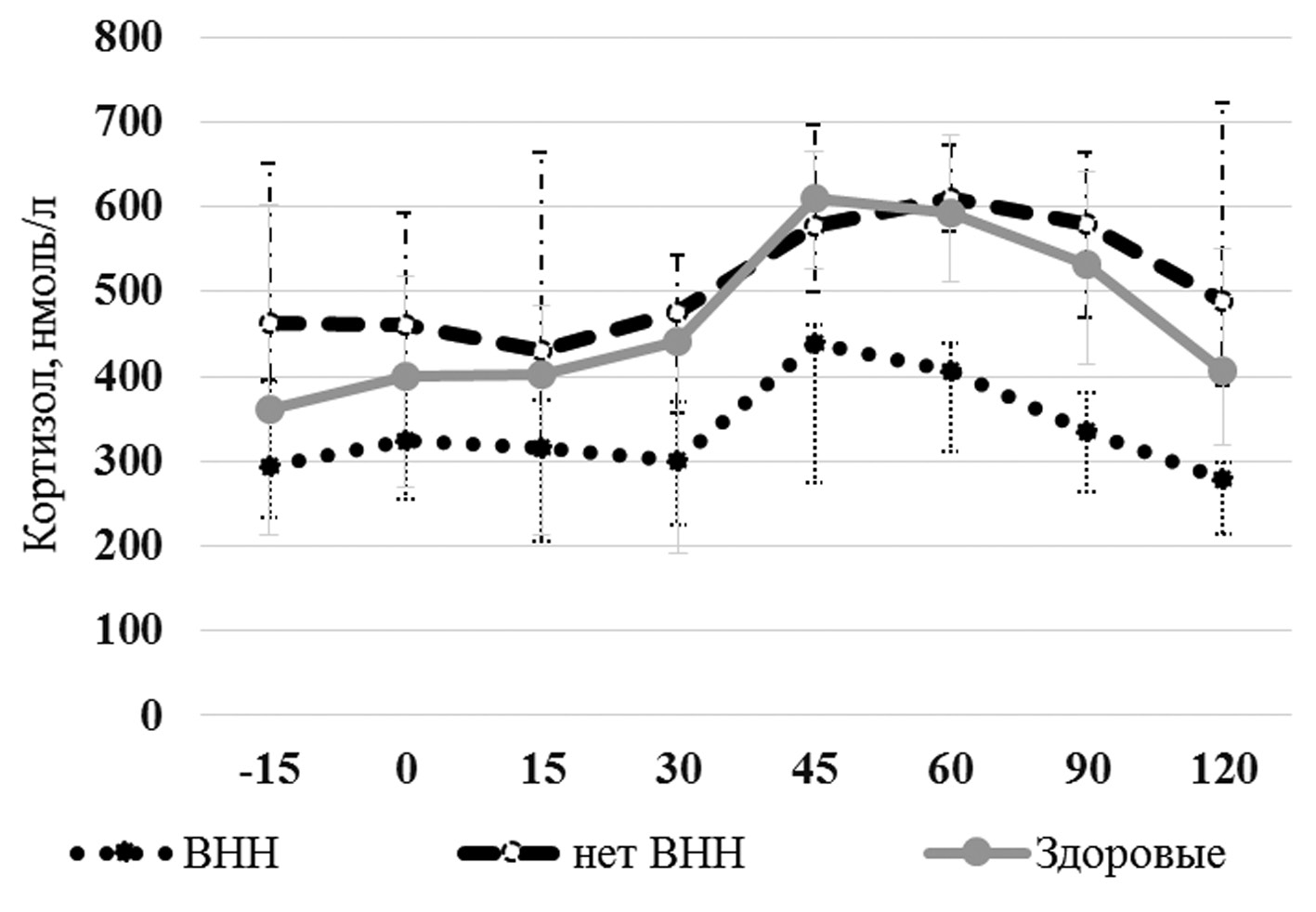 Согласно клиническим рекомендациям Европейского общества эндокринологов, точка разделения (cut-off) для исключения ВНН по уровню максимального кортизола варьирует от 500 до 550 нмоль/л и зависит от конкретного метода, использующегося лабораторией для его определения [12]. Учитывая, что у 3 здоровых добровольцев уровни максимального кортизола на фоне ТИГ составили 546, 547 и 549 нмоль/л, уровень 540 нмоль/л был принят как точка разделения для исключения ВНН у пациентов основной группы.