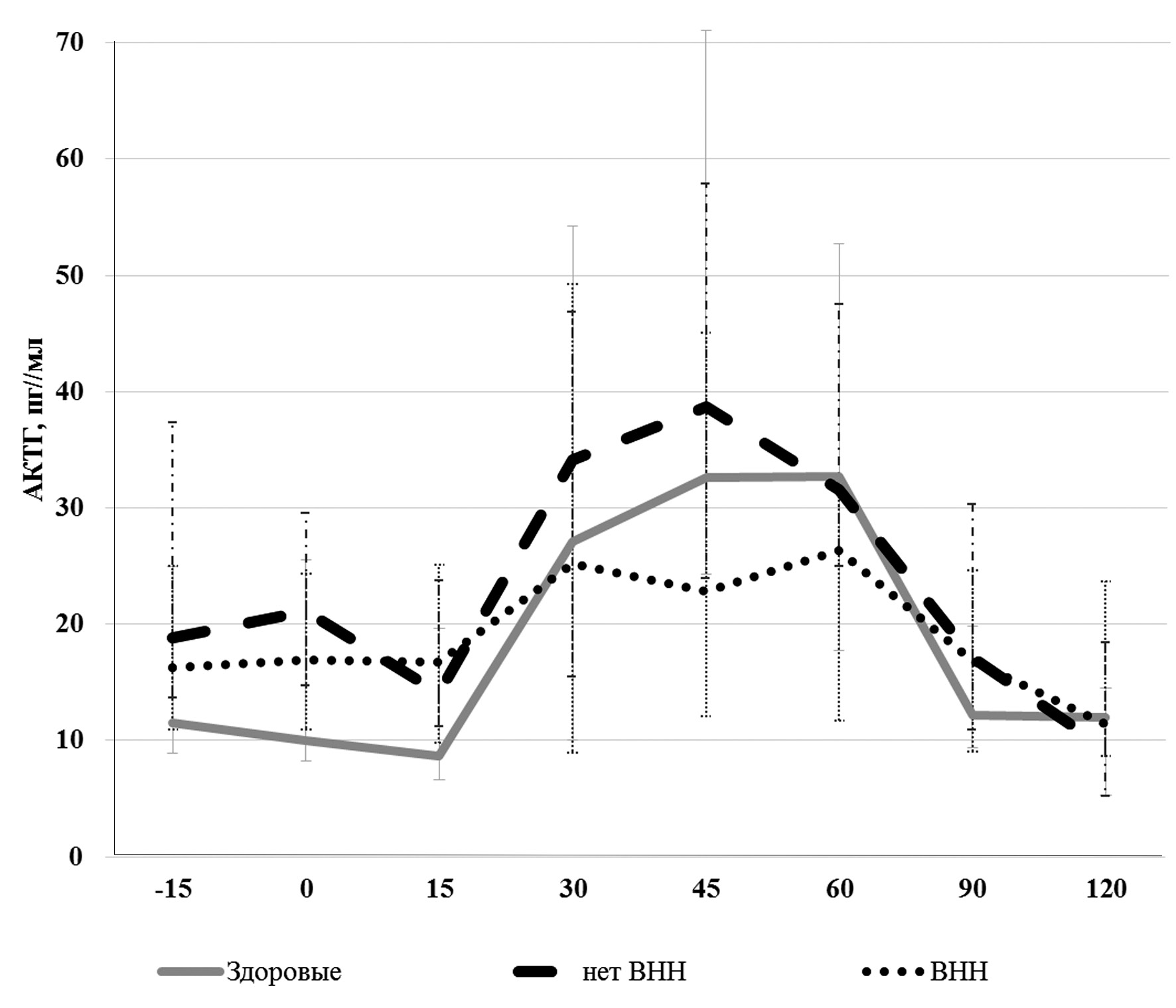 Тест с инсулиновой гипогликемией (ТИГ) начинался в 9.00–9.30. После ночного голодания в течение 8–14 ч пациентам устанавливался внутривенный катетер, проводился забор крови для определения глюкозы, АКТГ, кортизола, показателей биохимического и клинического анализов крови (0 мин). После 15 мин отдыха в катетер вводился инсулин короткого действия (Хумулин Регуляр, «Эли Лилли») из расчета 0,15–0,2 ЕД на 1 кг массы тела. Заборы крови для определения кортизола и АКТГ проводились на 15, 30, 45, 60, 90, 120-й минутах. Контроль глюкозы осуществлялся по глюкометру («Ime DC», Германия) каждые 15 мин до достижения уровня 3 ммоль/л, далее каждые 3–5 мин. После снижения уровня глюкозы (по глюкометру) менее 2,2 ммоль/л проводился забор крови для лабораторного определения и подтверждения гипогликемии. Гипогликемия купировалась внутривенным введением 60–80 мл 40% раствора глюкозы.