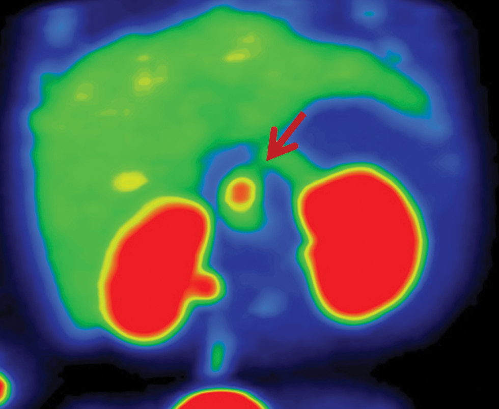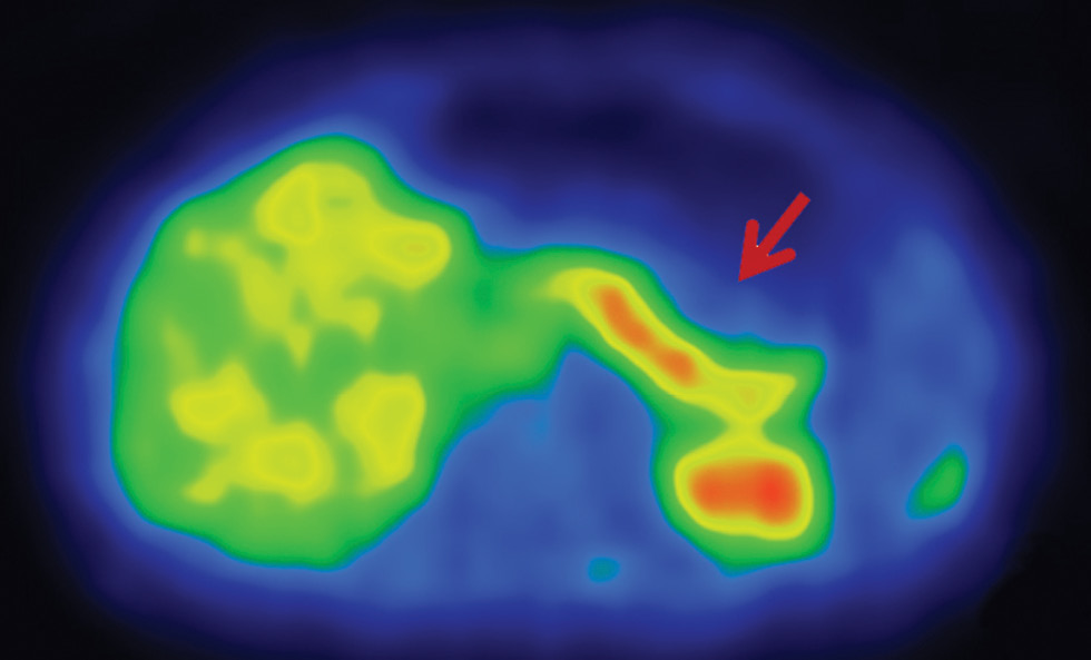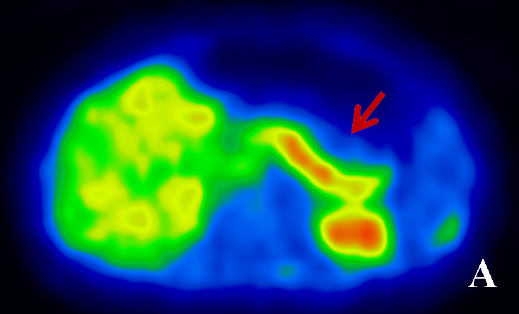 а – диффузная форма ВГИ. Захват 18F-ДОФА равномерен; б – фокальная форма ВГИ. Визуализируется очаг накопления радиофармпрепарата; в – эктопическая локализация фокальной формы ВГИ. Очаг накопления радиоизотопа визуализируется в области двенадцатиперстной кишки.