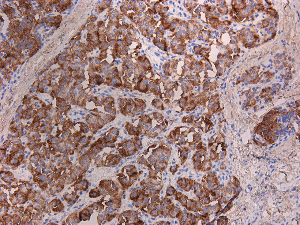 а – фокус гиперсекреции инсулина, метаплазия островков (окраска гематоксилином и эозином, ×20); б – выраженная экспрессия инсулина в фокусе при проведении иммунногистохимии; в – ткань поджелудочной железы вне фокуса гиперсекреции инсулина (окраска гематоксилином и эозином, ×200); г – низкая экспрессия инсулина вне фокуса при проведении иммунногистохимии.