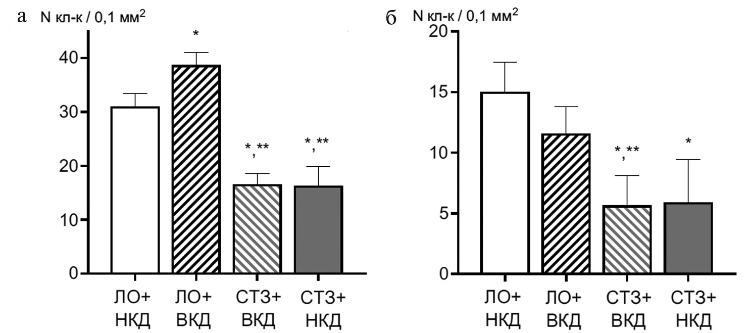 7. Fig. 7. Density of GFAP-positive astrocytes (a) and dopaminergic neurons (b) in the arcuate nucleus of the hypothalamus (M ± SD; ANOVA, posteriory test Tuki). | |