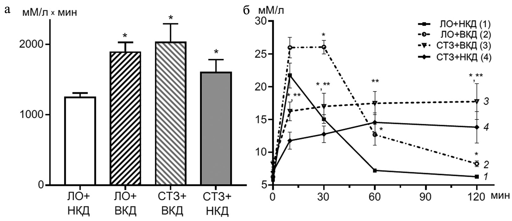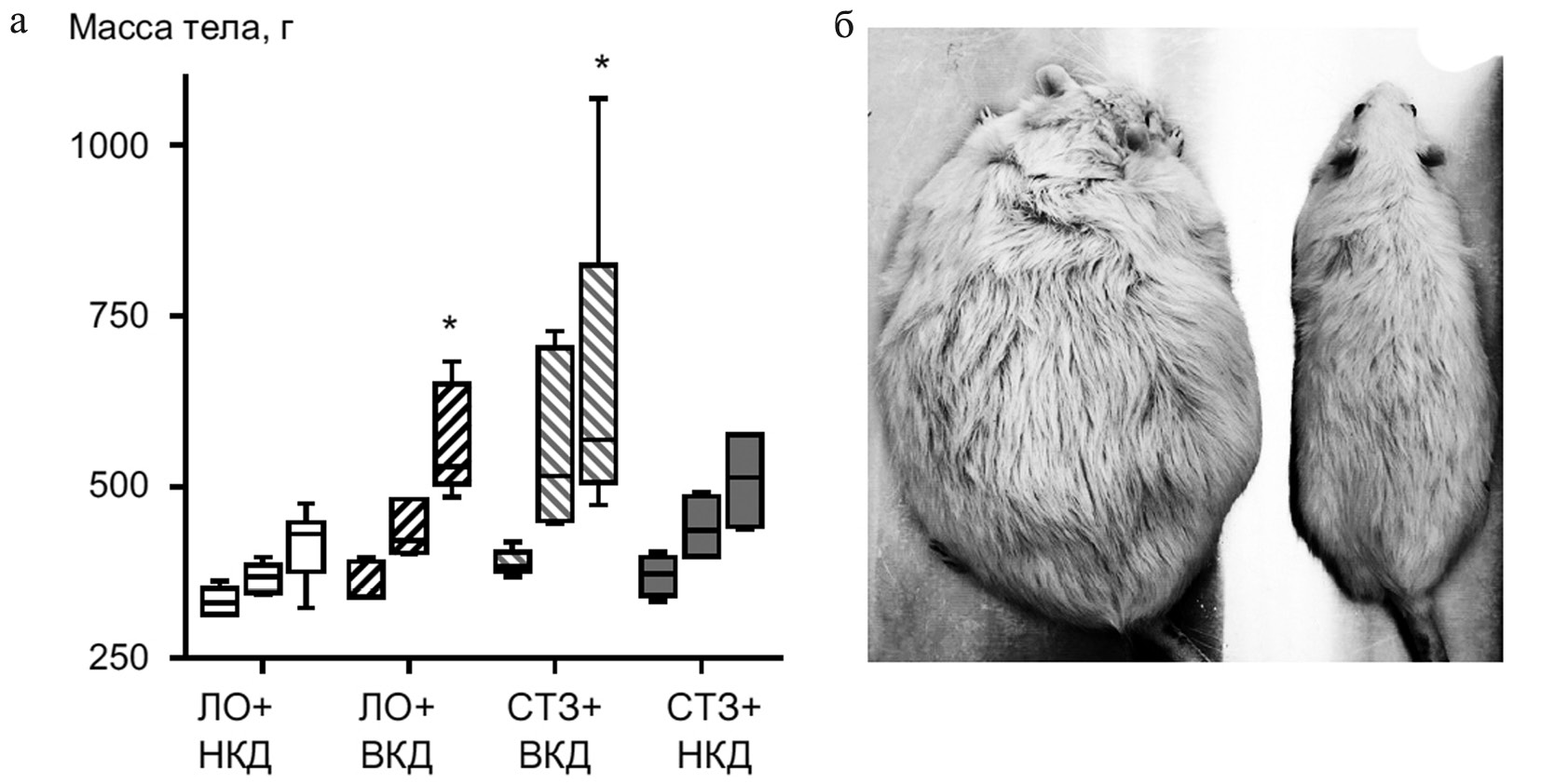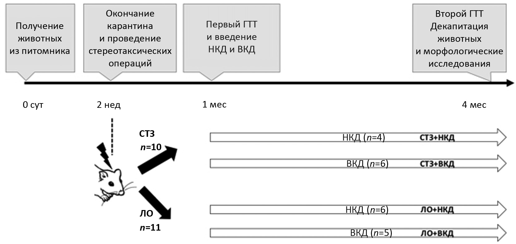 RESULTS: 3 months after surgical interventions and the appointment of diets, the glycemic curves significantly differed in the 4 studied groups: normoglycemia persisted only in the SO + NCD group, while HCD and the STZ administration were accompanied by the development of hyperglycemia (p = 0.0001). The STZ + NСD group, which represented the isolated effect of AD, was also characterized by impaired carbohydrate metabolism. A morphological study showed that HCD leads to a more pronounced ectopic accumulation of fat in the liver and pancreas tissue than NCD. The administration of STZ, regardless of the diet, led to changes typical for the AD model – an increase in the size of the ventricles of the brain, degeneration of white matter, and the accumulation of β-amyloid in the hypothalamus.