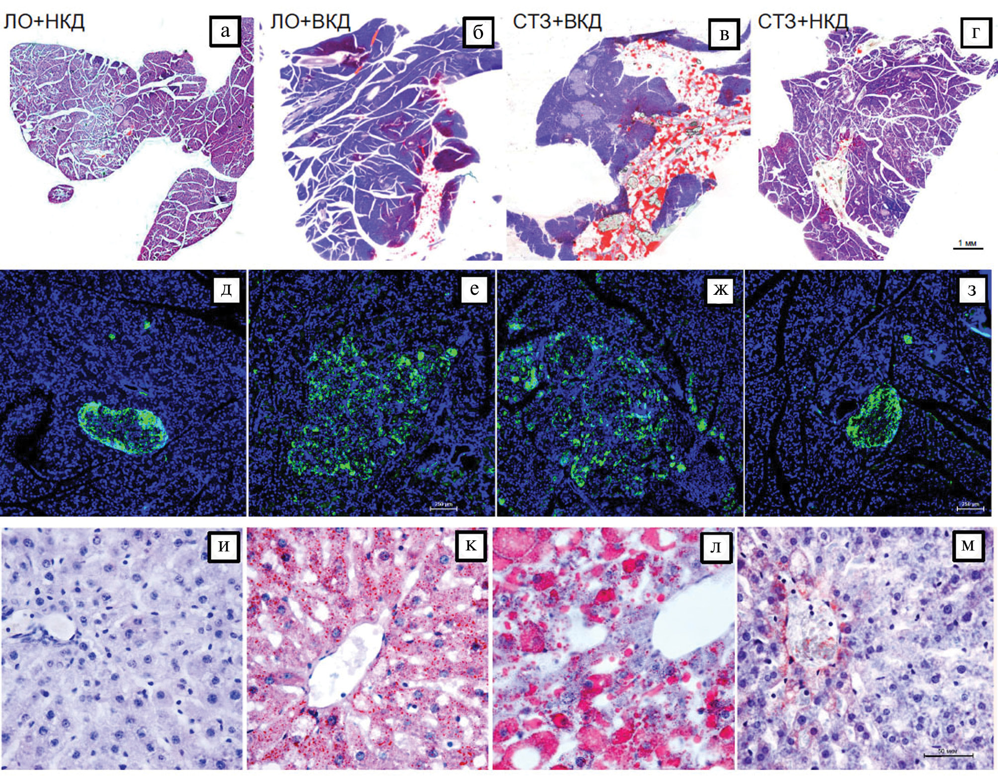 4. Fig. 4. Morphological pattern of pancreas (a-z) and liver (i-m) in animals treated with NCD (a, d, and), in group of CCD LO (b, e, k), group of CCC CTS (c, g, l) and group of CCC CTS (g, z, m): a-g, and red - detection by lip. D-h - pancreatic islets, detection of chromogranin A (green), nuclei of DAPI (blue). Scale: 1 mm - in figures a-g, 250 mcm - in figures d-h, 50 mcm - in figures i-m.