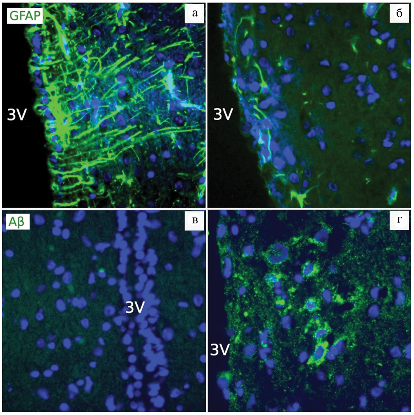 5. Fig. 5. Changes in the wall III of the ventricle of the brain and adjacent structures of the hypothalamus under the action of STZ (× 40): a, b - degeneration of GFAP-positive α-tanocytes, damage to the ventricle wall and reduction of astroglia density (GFAP dislocation); C, d is the accumulation of β-amyloid in neurons; Administration of physiological saline (a, c); Intracentricular administration of streptosocin (b, g); The cores are DAPI (blue).