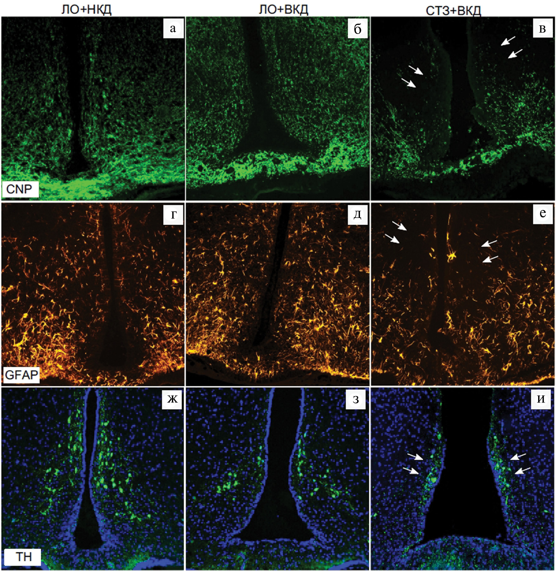 6. Fig. 6. Changes in the mediobasal structures of hypothalamus under the action of STZ (× 10): a, b, b - cyclonucleotide phosphatase (CNP); D, e, e is glyofibrillar protein (GFAP); G, h, and are dopamine (TH-positive) neurons of the arcuate nucleus. Symbols: arrows indicate areas of damage; The cores are DAPI (blue).