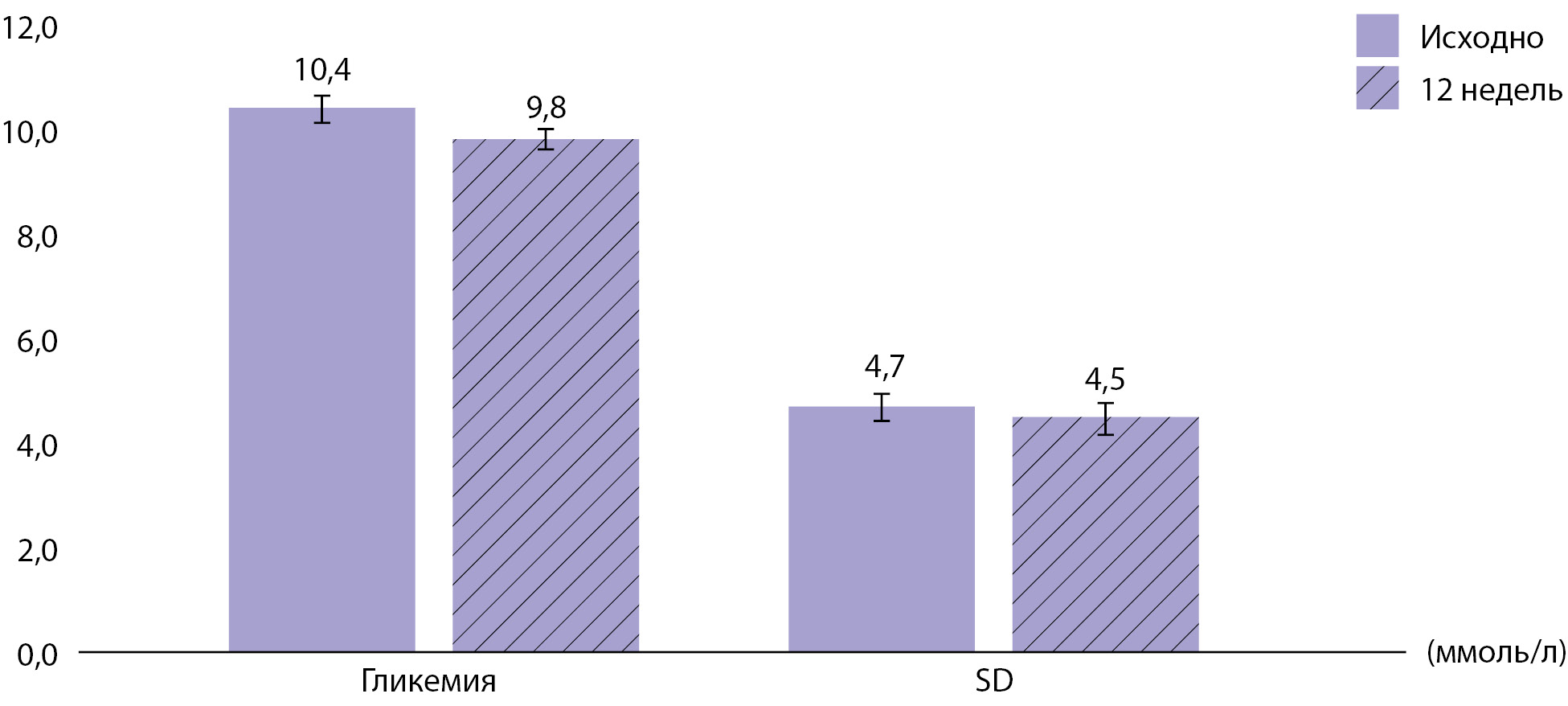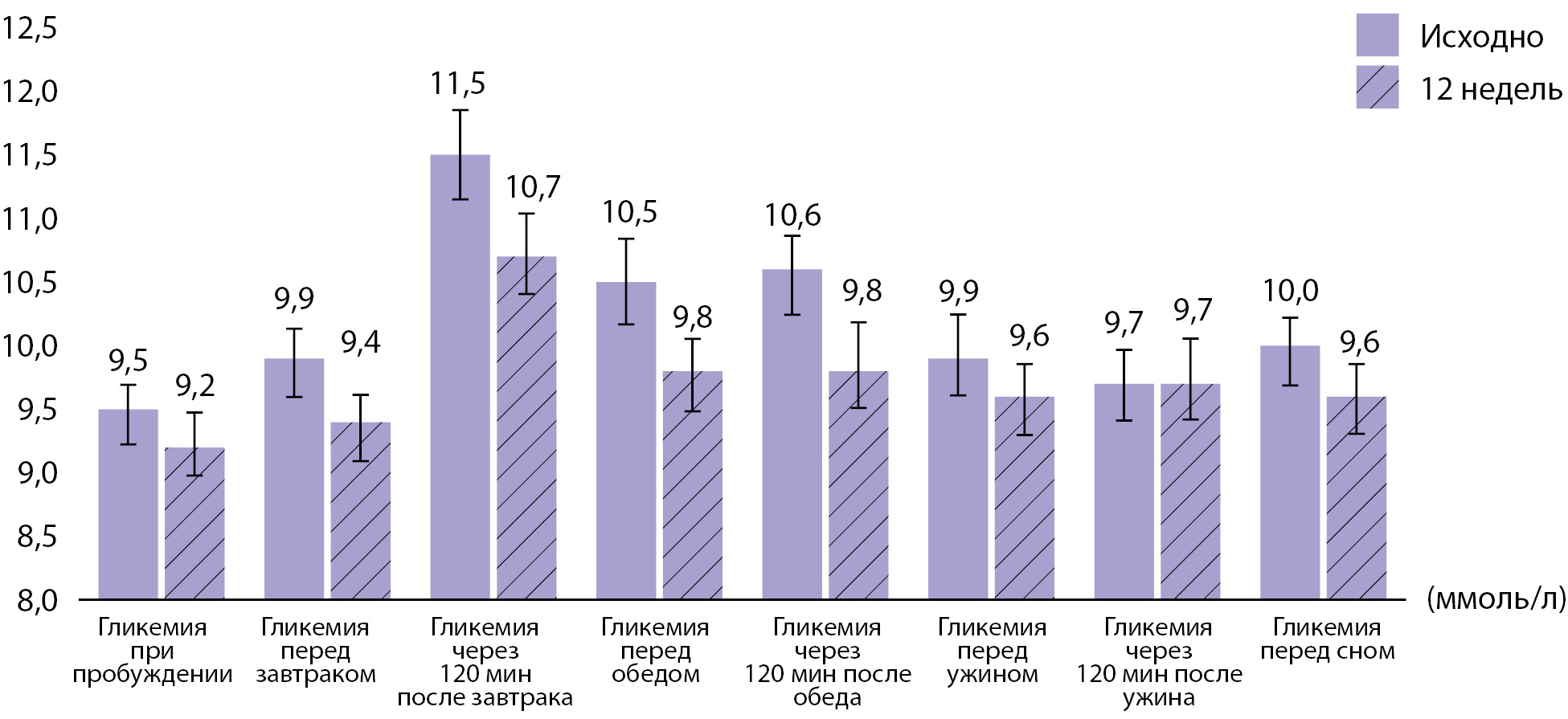 Гликемический профиль. Несмотря на то что к концу исследования отмечалась тенденция к более низким показателям гликемии по сравнению с исходным уровнем, все показатели гликемического профиля статистически значимо не изменились (см. табл. 2, рис. 4).