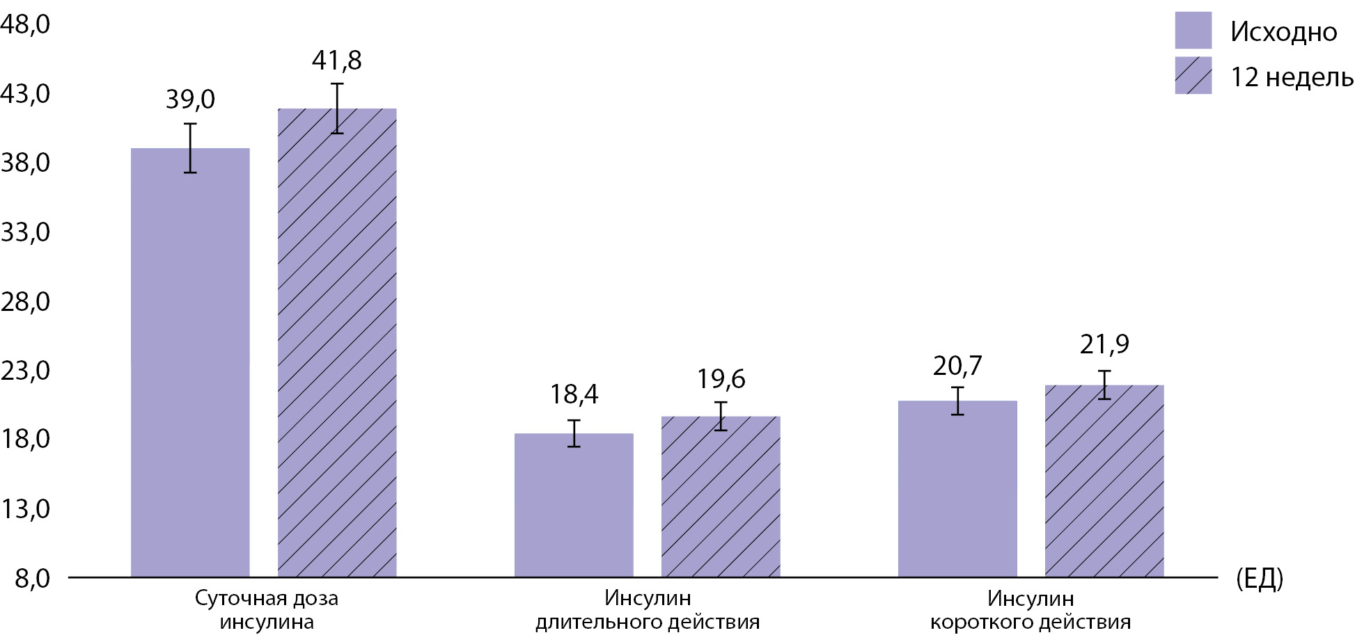 Инсулинотерапия. Проводимая инсулинотерапия, определяемая по среднесуточным дозам инсулина длительного и короткого действия, статистически значимо не изменилась к концу исследования по сравнению с исходным уровнем (см. табл. 2, рис. 5).
