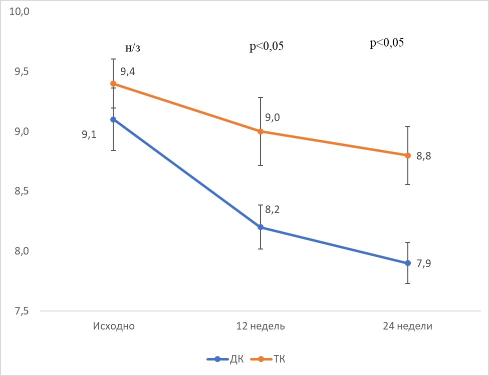 1. Рисунок 1. Динамика уровня гликированного гемоглобина (HbA1c) за время исследования в группах традиционного контроля (ТК) и дистанционного консультирования (ДК). Данные представлены в виде M±SEM