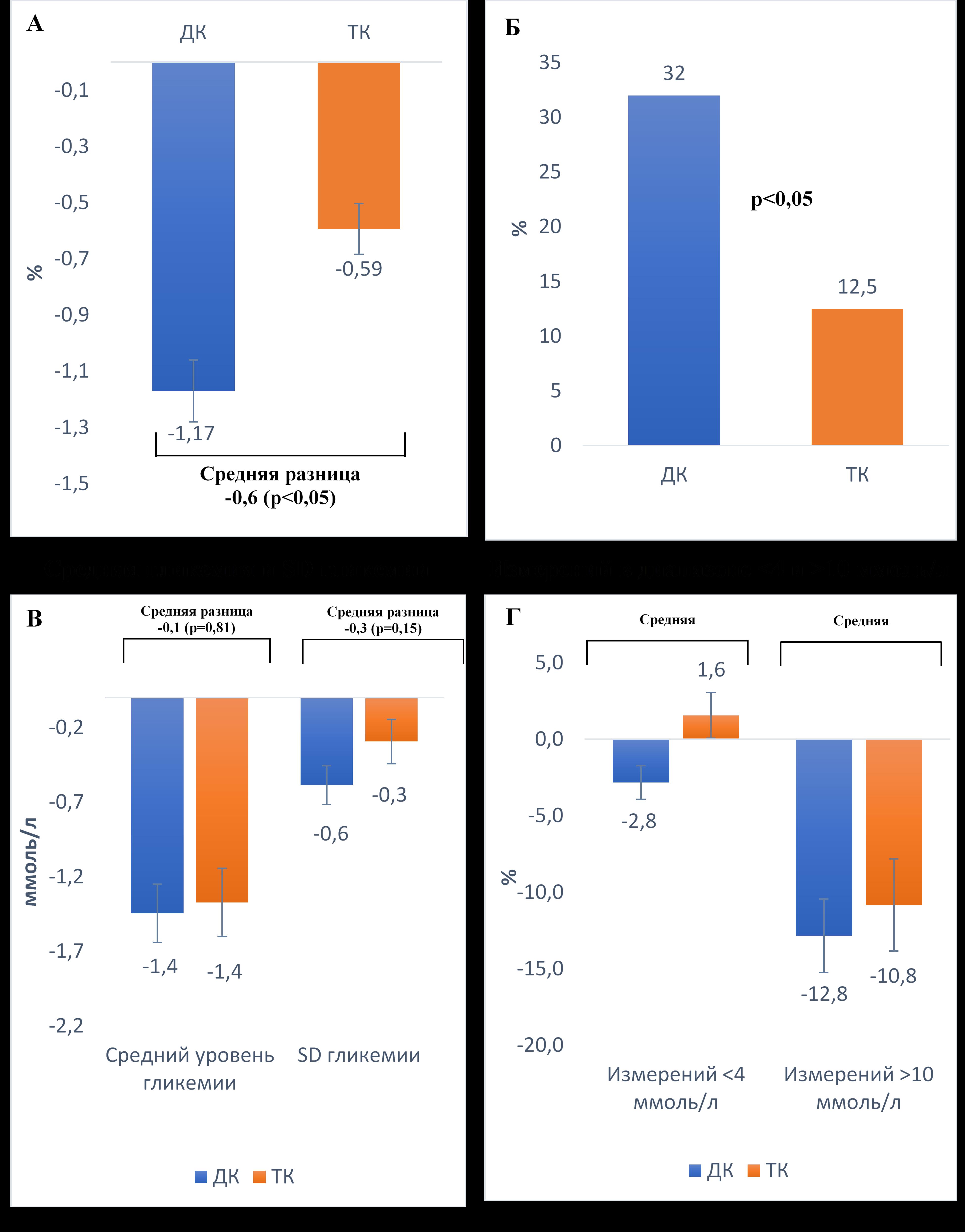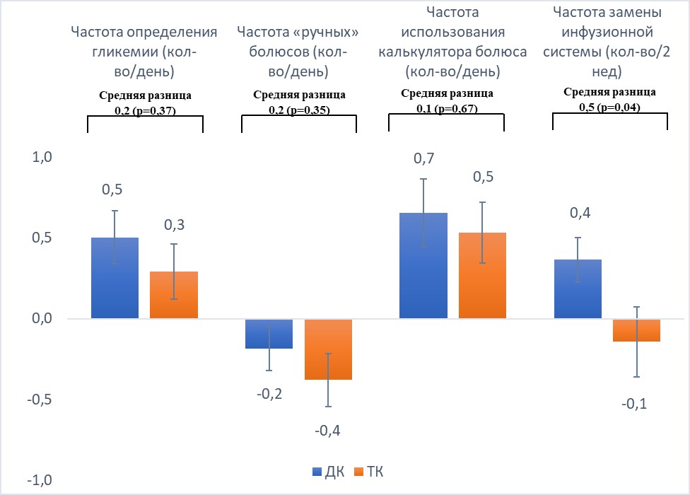 2. Рисунок 2. Изменение показателей гликемического контроля к концу исследования относительно исходных уровней в группе дистанционного консультирования (ДК) (синие столбцы) и традиционного контроля (ТК) (оранжевые столбцы). Данные представлены в виде M±SEM