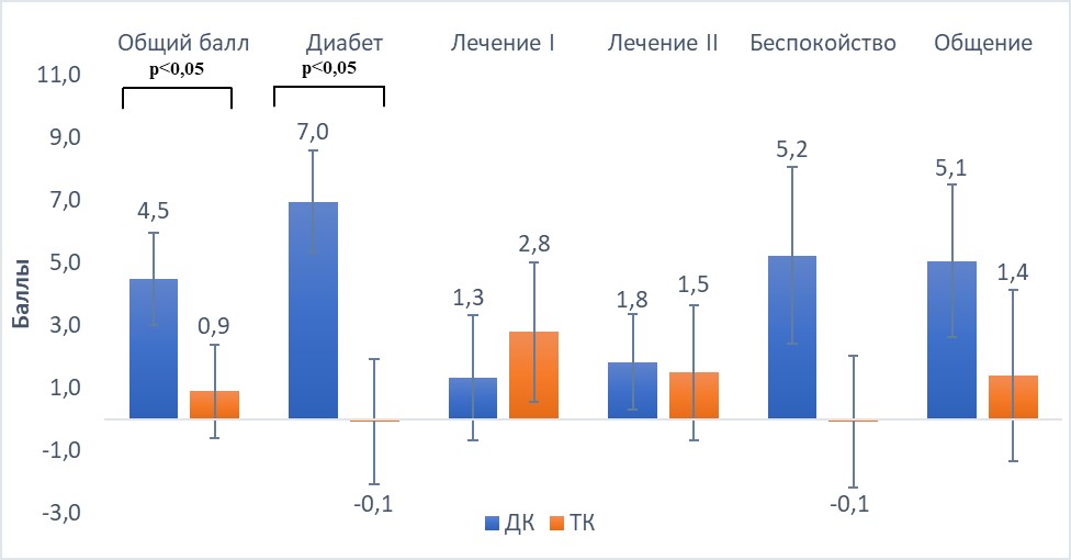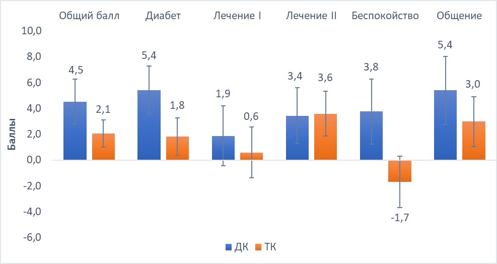 4. Рисунок 4. Изменение показателей качества жизни у родителей детей с сахарным диабетом 1 типа к концу исследования относительно исходных уровней. Данные представлены в виде среднее ± SEM. Уровень p везде >0,05 при сравнении показателей групп дистанционного консультирования (ДК) (синие столбцы) и традиционного контроля (ТК) (оранжевые столбцы)
