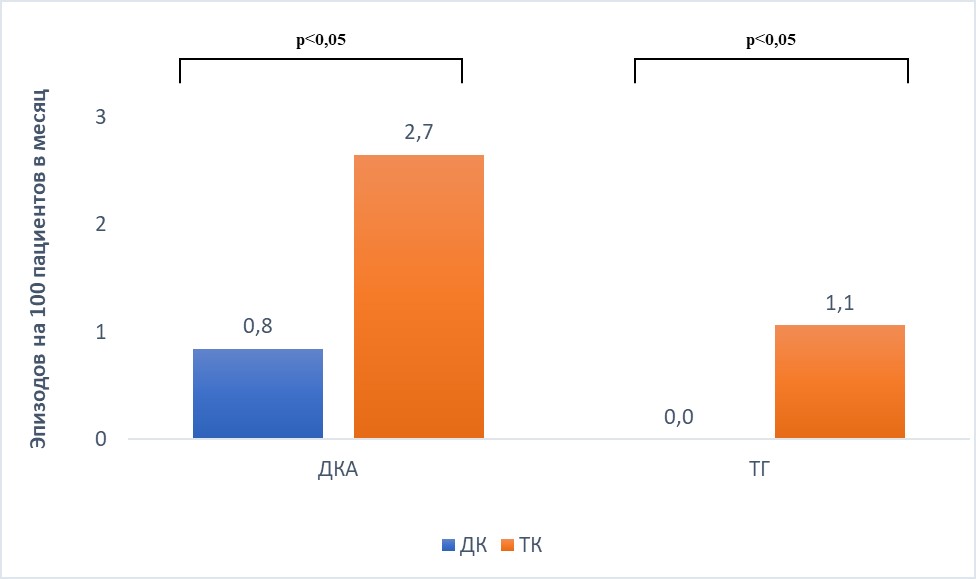 6. Рисунок 6. Частота эпизодов тяжелой гипогликемии (ТГ), диабетического кетоацидоза (ДКА) за время исследования в группе дистанционного консультирования (ДК) (синие столбцы) и традиционного контроля (ТК) (оранжевые столбцы). Данные представлены в виде числа случаев на 100 пациентов в месяц
