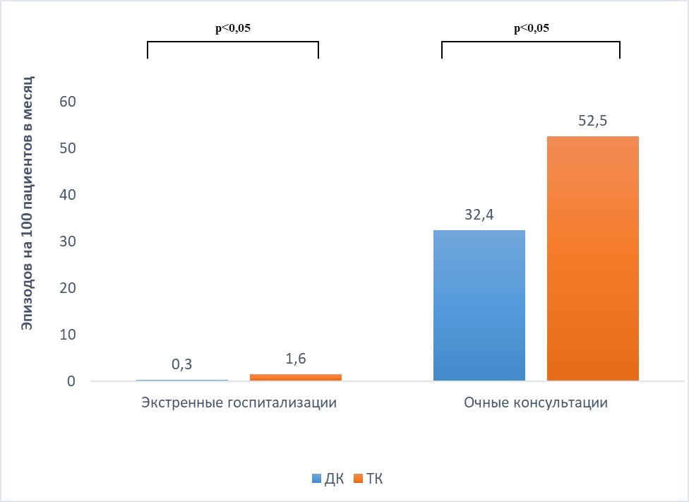 7. Рисунок 7. Частота обращений по экстренным/неотложным показаниям и очных консультаций за время исследования в группе дистанционного консультирования (ДК) (синие столбцы) и традиционного контроля (ТК) (оранжевые столбцы), данные представлены в виде числа случаев на 100 пациентов в месяц.
