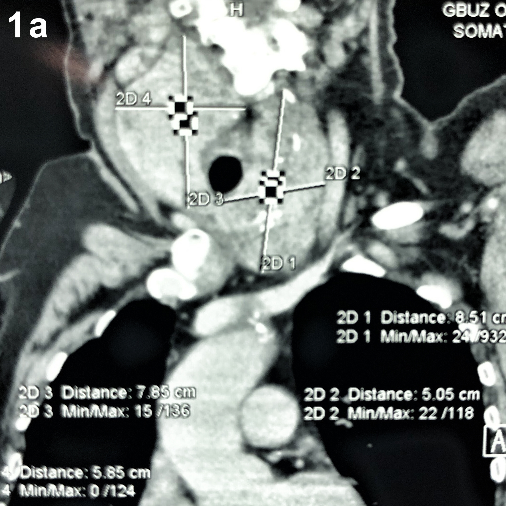 2. Рисунок 1a, b. Компьютерная томография шеи: диффузное увеличение щитовидной железы за счёт обеих долей с распространением загрудинно. Верхние полюса достигают сосцевидных отростков. Сужение просвета трахеи до 5 мм.