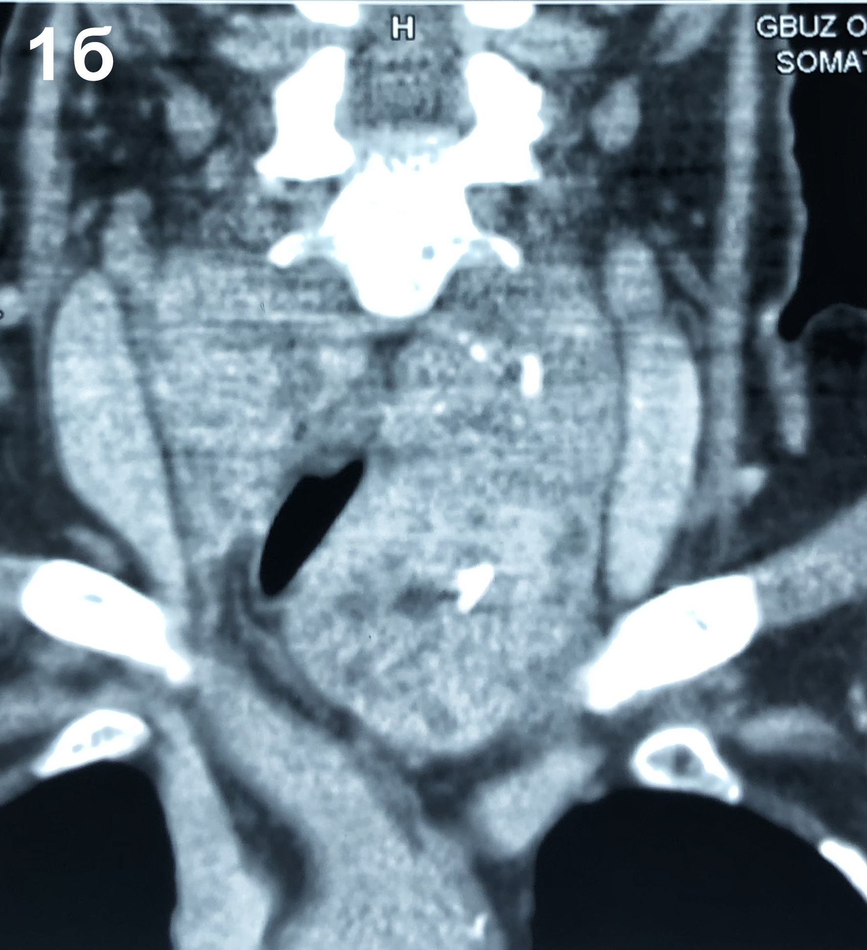 Выполняли электрокардиографию, фиброгастродуоденоскопию, ультразвуковое исследование сердца, органов брюшной полости и забрюшинного пространства. Анатомические особенности щитовидной железы определяли по данным ультразвукового исследования. Оценка сдавления органов шеи проводилась с использованием рентгеноскопии пищевода и мультиспиральной компьютерной томографии шеи.
