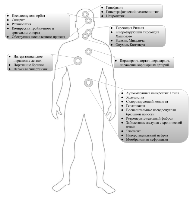 Многие заболевания человека сопровождаются изменениями сывороточного и тканевого содержания антител. Долгое время аутоиммунные патологические состояния со схожей гистологической картиной, такие как аутоиммунный панкреатит, опухоль Кюттнера, тиреоидит Риделя, склерозирующий холангит, ретроперитонеальный фиброз (в т.ч. мультифокальный фибросклероз) и другие (офтальмопатия, псевдоопухоль орбиты, менингит, мастоидит, отит, ларингит, фарингит, ринит, риносинусит, лимфаденит, панкреатит, холангит, пневмония, перикардит, мастит, тубулоинтерстициальный нефрит, простатит, аневризмы и прочее) считались самостоятельными заболеваниями (рис. 1).
