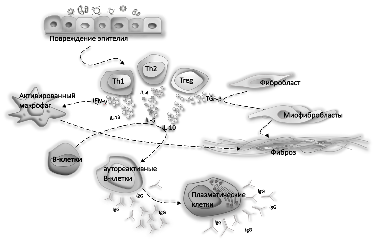 Клеточным маркером воспалительного фиброза могут являться М2-макрофаги, следовательно, и связанные с ними цитокины (IL-33, IL-10, CCL18) [19]. В силу выраженных фиброзно-воспалительных изменений повышение уровня циркулирующих плазмобластов может рассматриваться в качестве одного из маркеров данной группы заболеваний (чувствительность 95%, специфичность 82%) [22, 23] и предиктора прогноза успешности терапии [24]. CD4+ цитотоксические Т-лимфоциты коррелируют с активностью заболевания и с количеством очагов поражения [24].