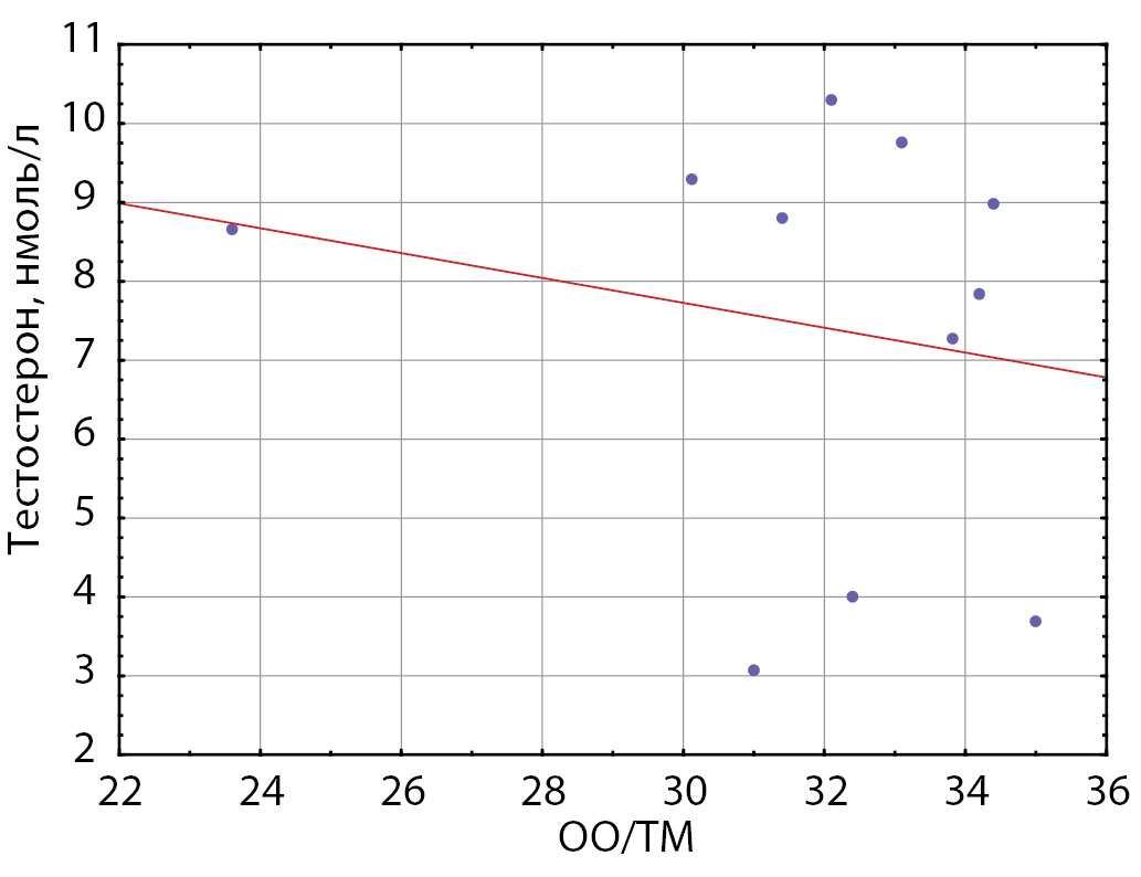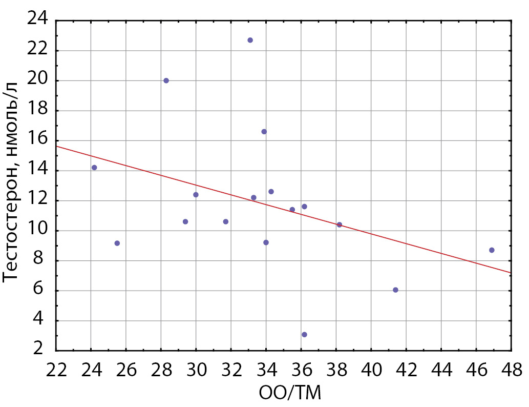 4. Picture. 4. Correlation of OO / HM index with testosterone level in patients of group 2 (without signs of androgen deficiency) (r = -0.51; p <0.05). OO - basic exchange; TM - lean mass.