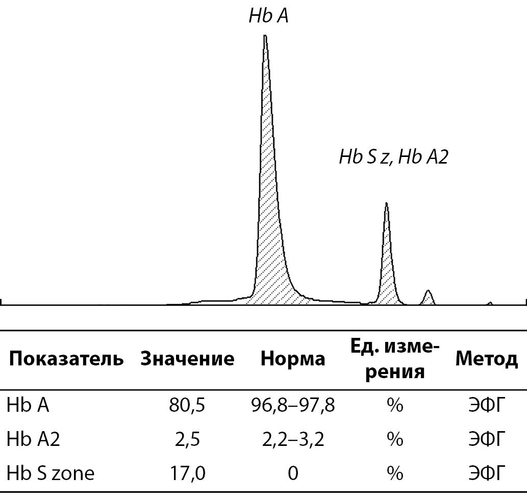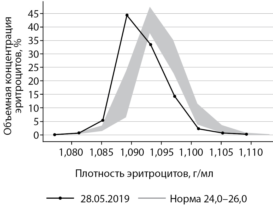По данным дообследования: в гемограмме эритроциты 4,33×1012/л, гемоглобин – 131 г/л, средний объем эритроцитов 85 фл, ретикулоциты 1,04%, при просмотре мазков телец Гейнца (Heinz) в эритроцитах не выявлено; в биохимическом анализе сыворотки крови общий билирубин – 24,2 мкмоль/л, связанный билирубин – 4,8 мкмоль/л, свободный билирубин – 19,4 мкмоль/л, железо – 10,2 мкмоль/л, АЛТ – 22 ед/л, АСТ – 27 ед/л, ГГТ – 18 ед/л, ЩФ – 195 ед/л, глюкоза – 5,0 ммоль/л, общий белок – 73 г/л, мочевина – 5,0 ммоль/л, креатинин – 67 мкмоль/л, мочевая кислота – 237 мкмоль/л, холестерин – 6,01 ммоль/л; по данным УЗИ органов брюшной полости и почек – без признаков патологии за исключением УЗИ-признаков застоя желчи в желчном пузыре, размеры и эхоструктура селезенки и печени нормальные; по электрофорезу гемоглобина 27.05.2019 была выявлена патологическая фракция HbS, составляющая 17% (рис. 1), а по данным исследования РЭПП было выявлено снижение средней плотности эритроцитов, при этом тяжелая и легкая фракции были в пределах нормы (рис. 2).
