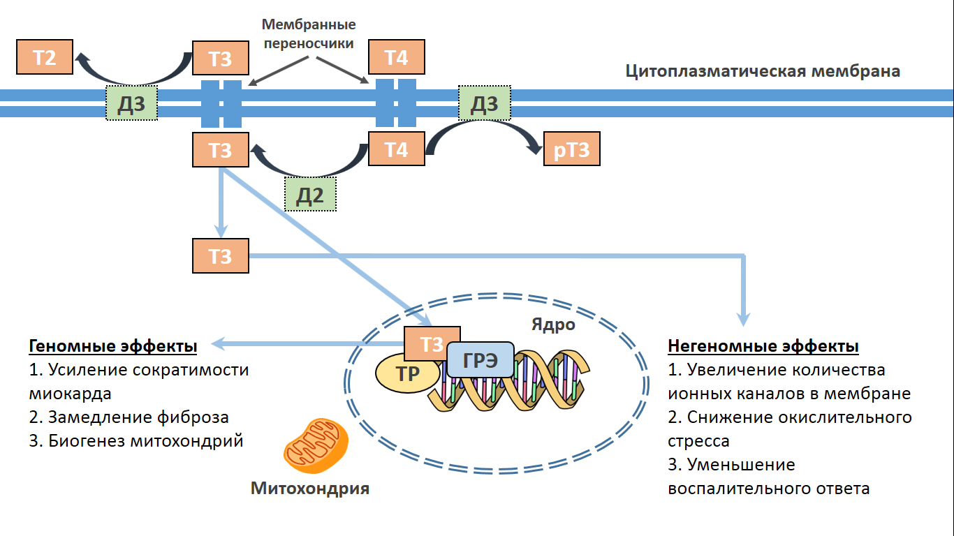 Рисунок 1. Действие тиреоидных гормонов на кардиомиоциты. Тиреоидные гормоны Т4 (тироксин) и Т3 (трийодтиронин) попадают внутрь кардиомиоцитов с помощью мембранных переносчиков. Внутри клетки Т4 может быть активирован дейодиназой 2 типа (Д2) = трансформирован в Т3. И Т4, и Т3 могут быть деактивированы дейодиназой 3 типа (Д3) и трансформированы в реверсивный Т3 (рТ3) и дийодтиронин (Т2) соответственно. Из цитозоля Т3 проникает в ядро, в присутствии гормонреспонсивных элементов (ГРЭ) связывается с рецепторами тиреоидных гормонов (ТР) и инициирует регуляцию таргетных генов и других путей метаболизма (геномные эффекты). Также тиреоидные гормоны имеют и негеномные эффекты. Адаптировано из [3].