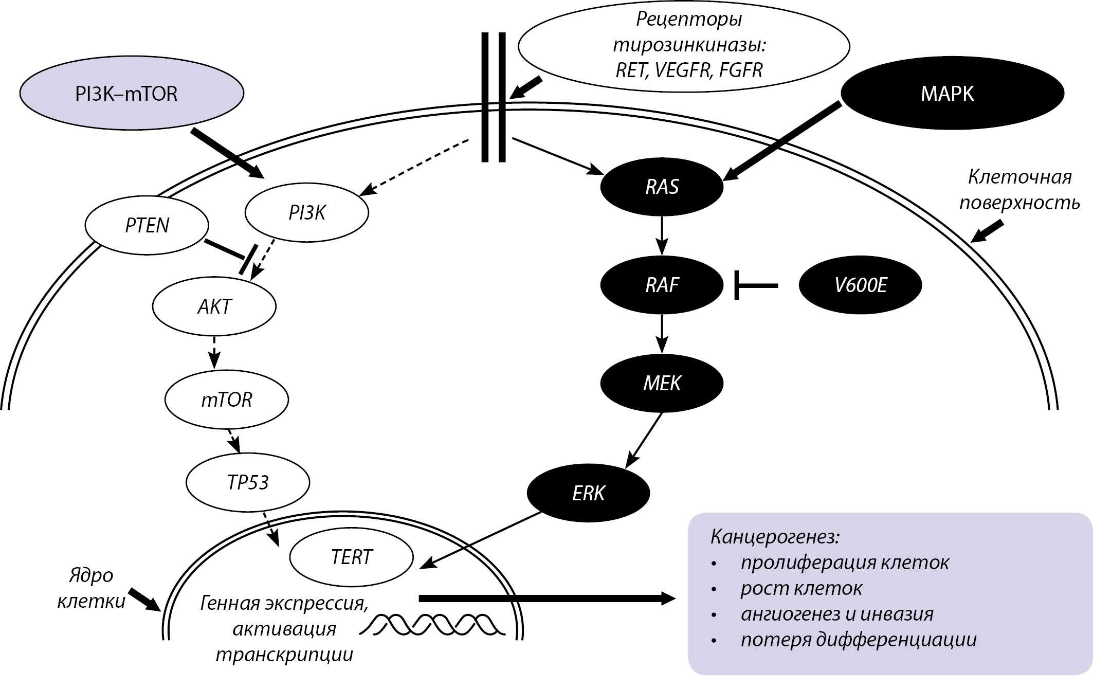 РЩЖ характеризуется молекулярными изменениями, такими как активирующие/инактивирующие мутации, перестройки, делеции и изменения числа копий в генах, ответственных за пролиферацию клеток, дифференциацию и апоптоз [16]. В канцерогенезе РЩЖ участвует несколько основных сигнальных путей. С помощью рецепторов регистрируются все меж- и внутриклеточные сигналы, далее они обрабатываются посредством каскада точно согласованных действий сигнальных путей, которые направляют работу ядерных белков. Основным моментом в функционировании сигнальной трансдукции являются контроль и регуляция генной экспрессии. Клетка реагирует на поступающие сигналы, интегрирует их и посредством активации или подавления активности тех или иных генов преобразует в требуемый клеточный ответ. Любые нарушения регуляции или разлад равновесия сигнальных процессов приводят к серьезным последствиям как для отдельной клетки, так и для всего организма. И в первую очередь это относится к ключевым клеточным процессам: пролиферации, дифференцировки и апоптоза. Так, регуляционные нарушения зачастую вызваны мутациями в протоонкогенах или генах опухолевой супрессии, что ведет к малигнизации клеток и развитию канцерогенеза. Опухолевый рост и прогрессирование РЩЖ тесно связаны с соматическими точечными мутациями в генах BRAF, RAS и RET. Данные мутации способствуют активации сигнальных путей пролиферации митоген-активированной протеинкиназы (MAPK) и фосфоинозитид-3-киназы (PI3K), являющихся ключевыми в развитии РЩЖ (рис. 1). Как только экспрессия генов изменяется, начинается развитие РЩЖ, происходят усиление пролиферации клеток, их неограниченный рост и потеря дифференцировки, активация ангиогенеза, инвазии. Сигнальный путь WNT является сигнальным каскадом, в котором задействованы белки, являющиеся супрессорами опухолевого роста, необходимыми для полноценного эмбрионального развития, поддержания фенотипа клеток и дифференцировки. Сигнальные пути рецептора тирозинкиназы (RTK), пути p53 и p73 также вовлечены в многоступенчатый процесс клеточного взаимодействия при РЩЖ, модулируют ангиогенез, пролиферацию и дифференцировку [10, 17]. Изменения всех этих каскадов могут быть связаны между собой различными механизмами, включая генетические и эпигенетические модификации в рецепторах путей и эффекторах [18].