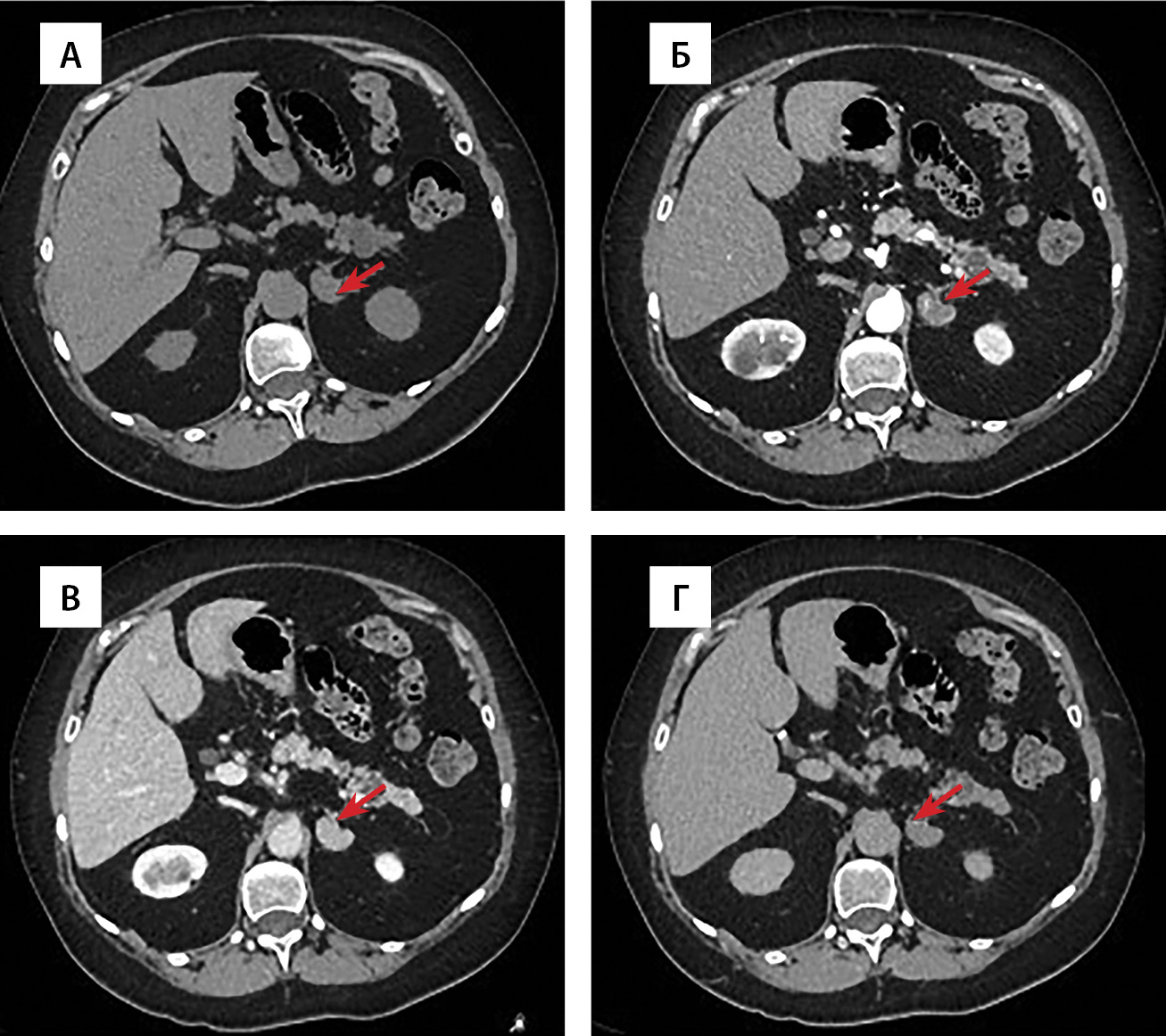 Рисунок 1. Мультиспиральная компьютерная томография образования левого надпочечника, аксиальная проекция: А — нативная фаза; Б — артериальная фаза; В — портальная фаза; Г — отсроченная фаза.