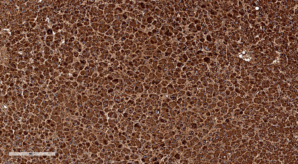 Рисунок 5. Очаговая экспрессия Melan A опухолевыми клетками. Увеличение ×100.