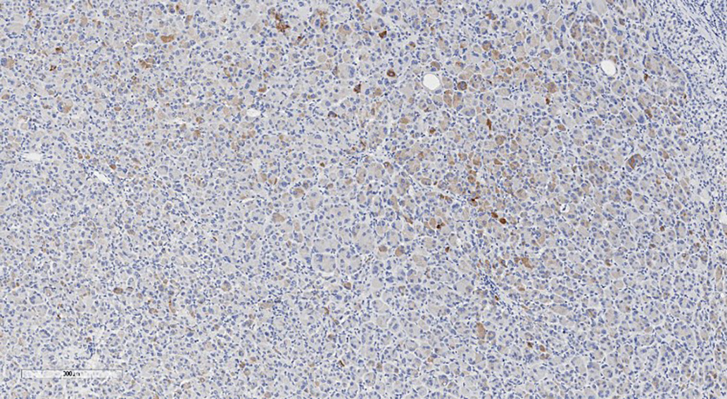 Рисунок 6. Очаговая экспрессия Inhibin А опухолевыми клетками. Увеличение ×100.