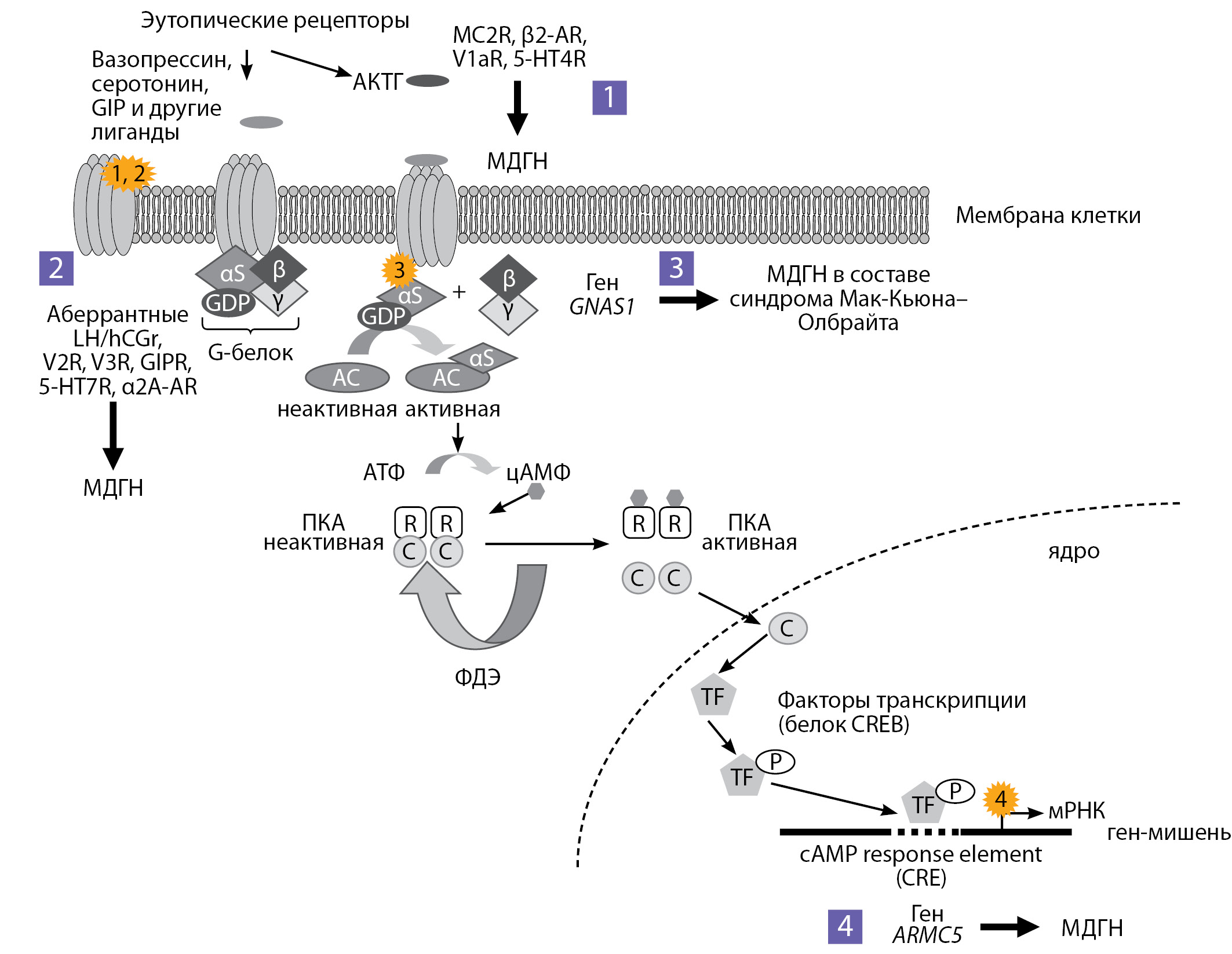1. Рисунок 1. цАМФ/ПКА-сигнальный путь и основные изменения, приводящие к макронодулярной двусторонней гиперплазии надпочечников (адаптировано из: Vélayoudom-Céphise FL (2016) [12]. АКТГ — адренокортикотропный гормон; MC2R — меланокортикотропный рецептор; LH/hCGR — ЛГ/ХГЧ-рецепторы; V1aR, V2R, V3R — рецепторы вазопрессина; GIPR — рецептор глюкозозависимого инсулинотропного пептида; 5-HT4R и 5-HT7R — рецепторы серотонина; α2А-АR — α2-адрено- рецептор; β2-AR — β2-адренорецептор; АС — аденилатциклаза; АТФ — аденозинтрифосфат; цАМФ — циклический аденозинмонофосфат; ПКА — протеинкиназа А; R — регуляторная субъединица протеинкиназы А; С — каталитическая единица протеинкиназы А; FT — факторы транскрипции; CREB — CREB-связывающий белок; CRE — cAMP response element или элемент ответа цАМФ; мРНК — матричная РНК, ФДЭ — фосфодиэстераза.