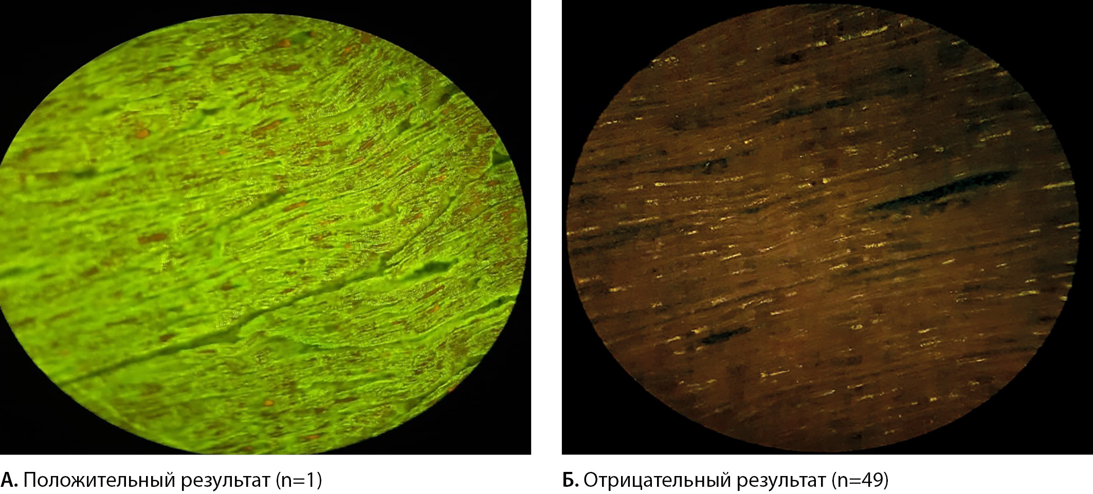 1. Рис. 1. Результаты определения антител к антигенам сердечной мышцы у пациентов с аутоиммунным полигландулярным синдромом 2, 3 типов (n=50) методом непрямого иммунофлюоресцентного анализа. В 1 случае (А) выявлен положительный результат, в 49 случаях (Б) антитела не определялись.