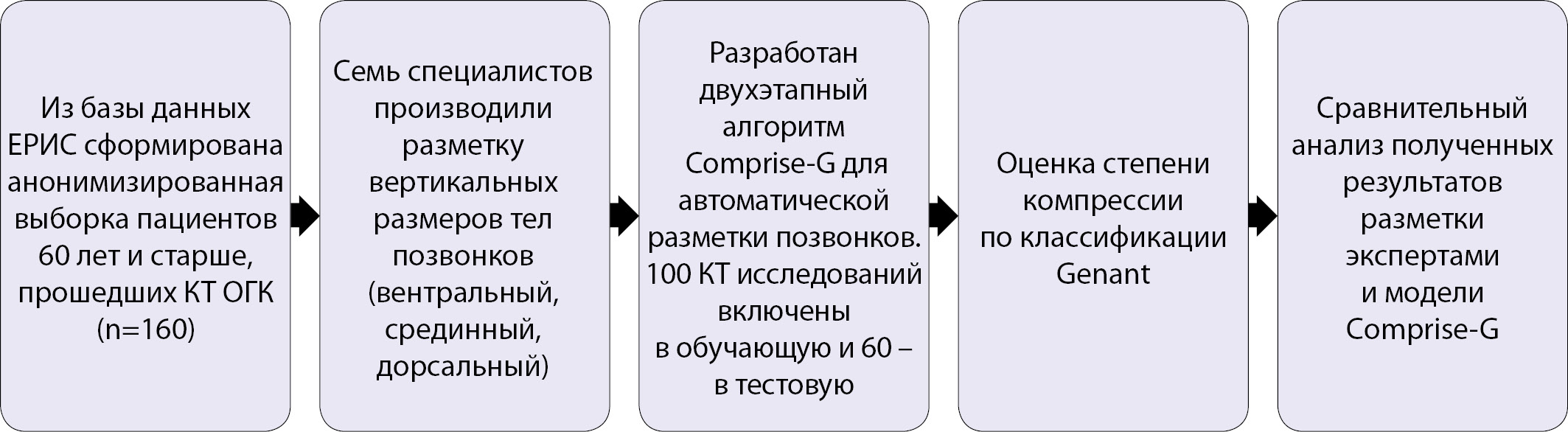 МЕТОДЫ. С сентября 2019 г. по май 2020 г. было проведено ретроспективное выборочное исследование, основанное на результатах КТ органов грудной клетки (ОГК). Были отобраны и анонимизированы результаты 160 КТ ОГК пациентов старше 60 лет, у 60% из которых отмечались переломы с компрессией более 25%. Разметка данных выполнена семью разметчиками. Проводились морфометрический анализ с вычислением средних размеров (вентрального, медиального, дорсального) тел позвонков и последующая полуколичественная классификация степени компрессии по Genant. Размеченный набор данных использовался для обучения созданной на основе двух сверточных нейронных сетей (CNN) модели ИИ Comprise-G, которая в последующем производила аналогичные измерения размеров тел позвонков с расчетом степени компрессии. Оценку модели выполняли по методу анализа ROC-кривых, расчета чувствительности и специфичности.