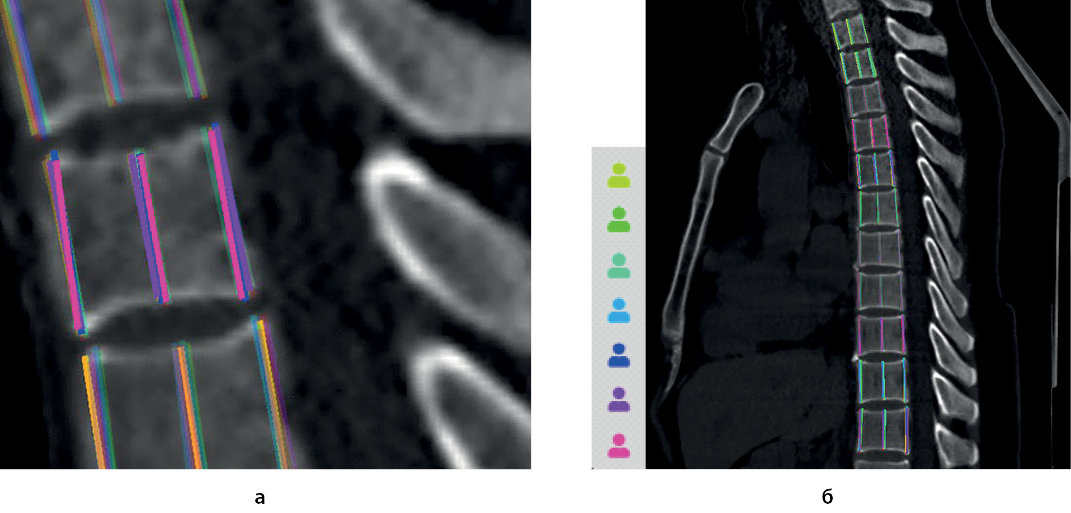 2. Рисунок 2. Пример разметки: а) разметка вентрального, медиального и дорсального размеров отдельного позвонка (ThII); б) Разметка грудного отдела позвоночника от ThI до ThXI. Приведены данные по семи разметчикам, маркированные цветом (интерфейс валидатора, представлены результаты всех разметок). Ярким цветом подсвечены измерения в плоскости реконструкции, более темные измерения в параллельных плоскостях, отражаемые проекционно. | |