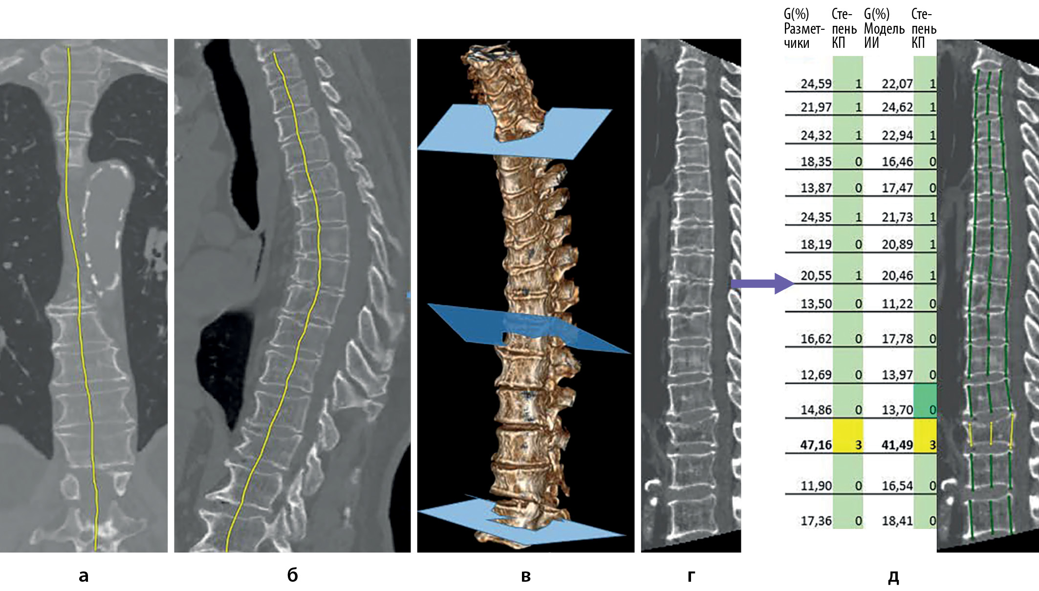 3. Рисунок 3. Обзор работы модели Comprise-G. Этап 1: локализация центров позвонков на 3D-КТ а) в корональной; б) в сагиттальной плоскости; в) 3D-модель с непараллельными плоскостями, направленными перпендикулярно позвоночному столбу; г) создание 2D-изображения путем «выпрямления» позвоночника. Этап 2: д) определение ключевых точек и соответствующих высот тел позвонков, расчет индекса G: цветом обозначена степень компрессии позвонка по Genant (зеленый цвет — норма и слабая степень компрессии: 0; 1, желтый — средняя и выраженная 2; 3). | |