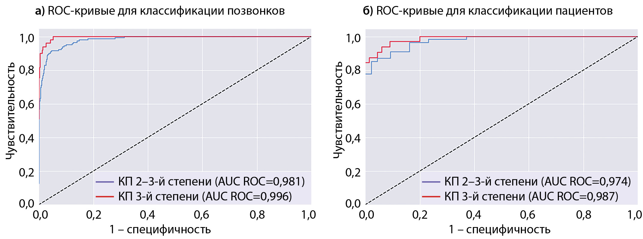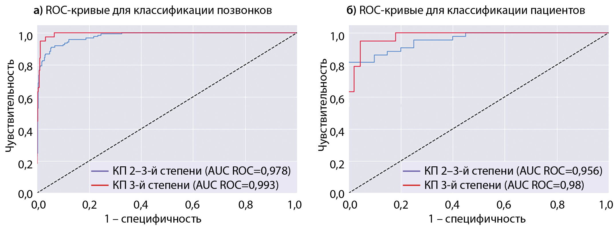 4. Рисунок 4. ROC-кривые для классификации позвонков (а) и пациентов (б) по степеням компрессии с помощью модели искусственного интеллекта Comprise-G по данным кросс-валидации (N=1249 позвонков, 100 пациентов) | |